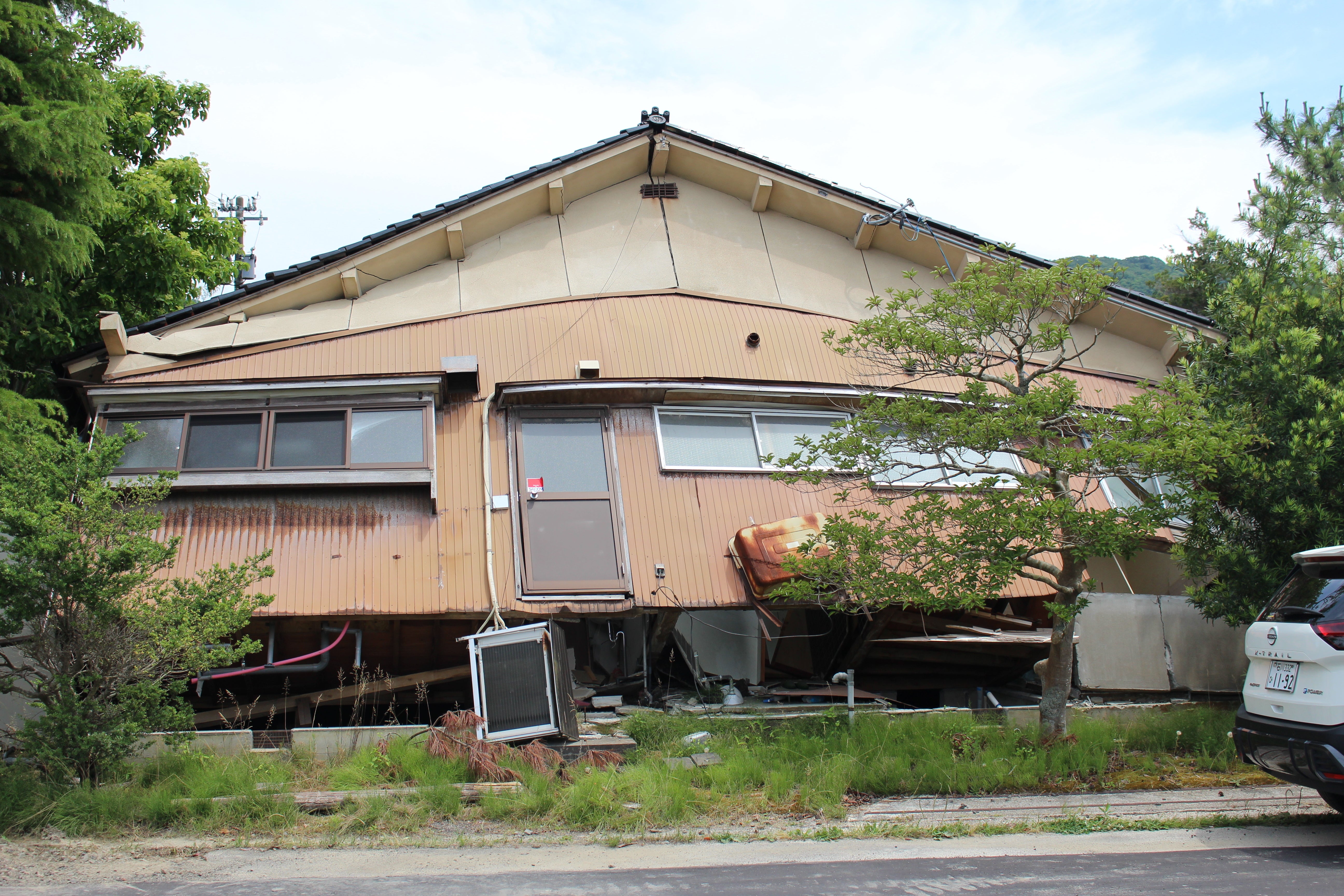 家屋が土台から外れて、後へ反り返り、倒れています。絵的には目立ちませんが、こんな家屋も多かったです。知人の家の1つは倒れずにいましたので、避難所へ行かずに土間で数日間を過ごしたと言っていましたが、屋内も陥没と隆起で波打っており、ほんの数分間、中に立っているだけで、クラクラして思わず飛び出してしまいました。