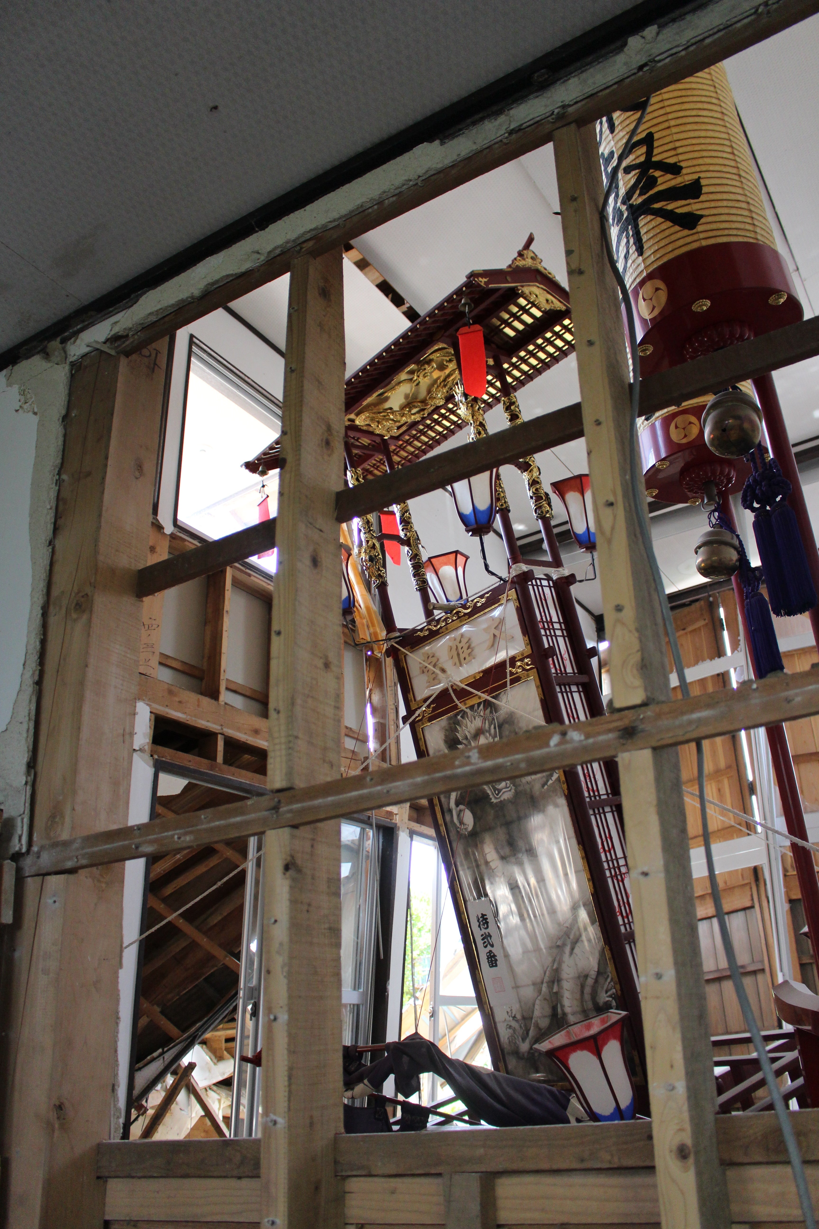 そんな家の傍の倉庫に能登のお祭りに欠かせない「キリコ」が閉じ込められていました。輪島塗が施された特別製の山車は、奇跡的に壊れずに残りましたが、今後は保存場所の問題や、祭自体の復興の時期などを鑑みても、廃棄しか無いと寂しそうにおっしゃっていました。