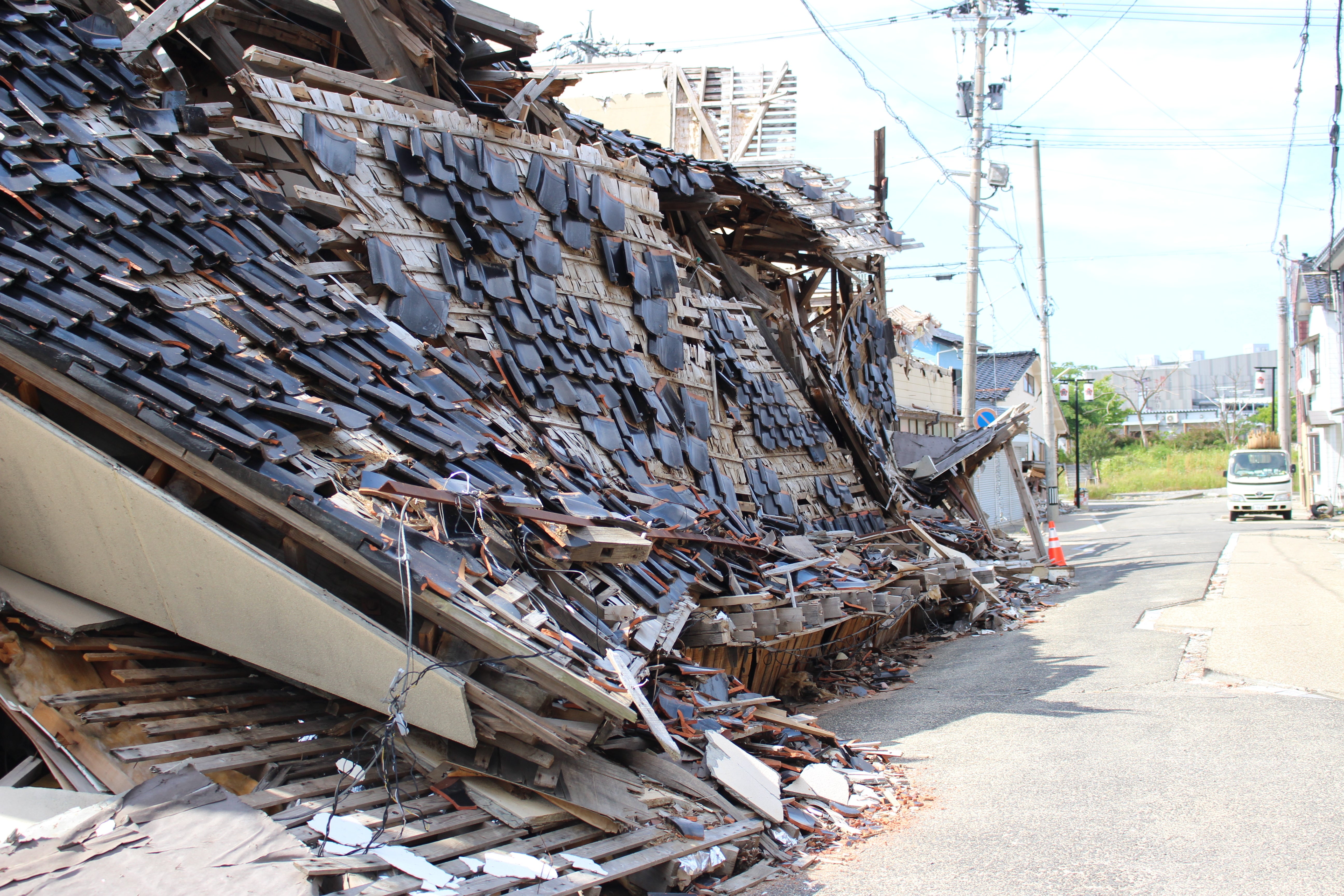 市街地で目立つのは、黒瓦と呼ばれる勇猛な姿の瓦屋根の崩壊です。家を守っていた重厚な瓦ゆえに、その重さで多くの住居が倒れていました。