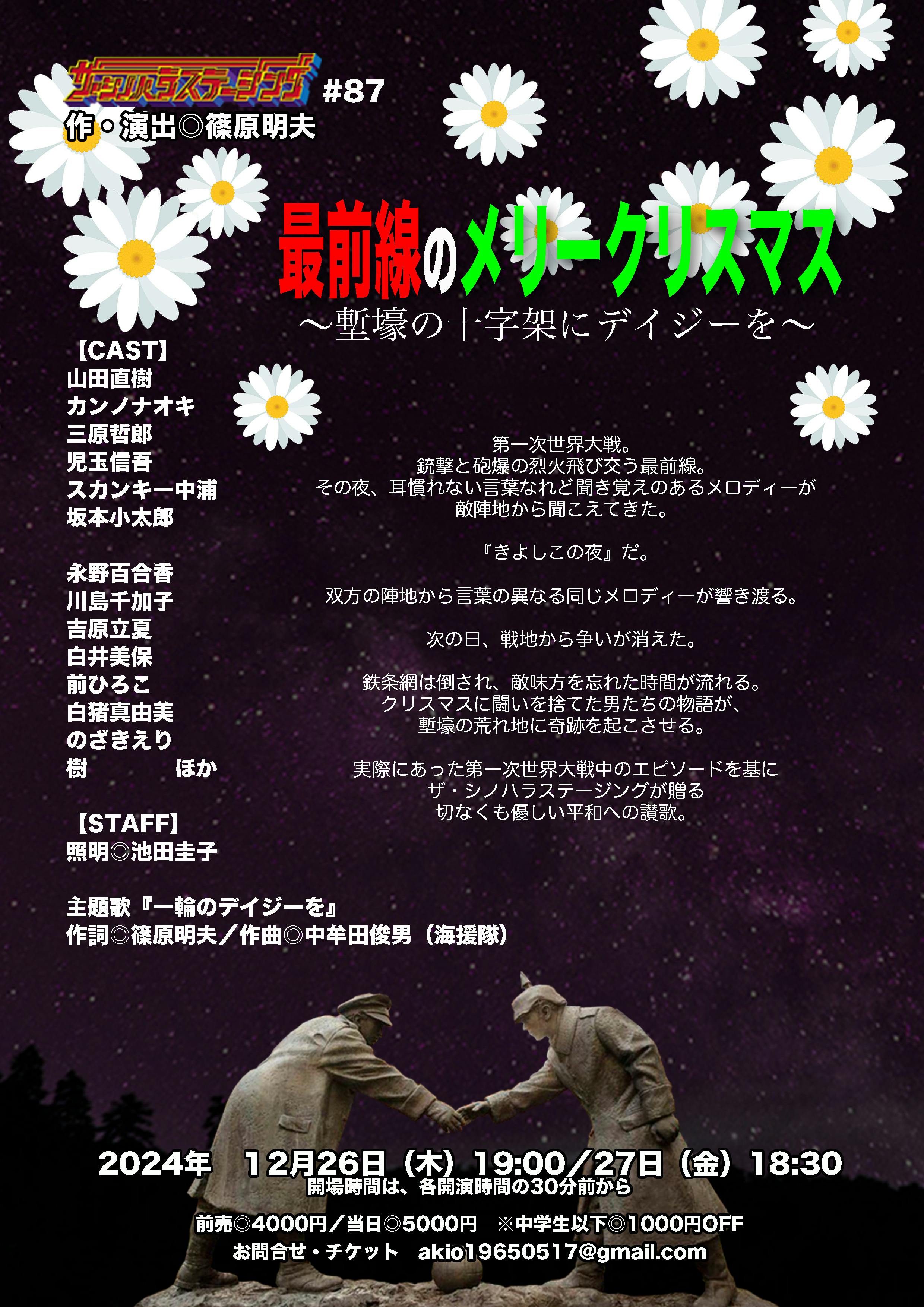 2024/08/13 23:26過日、能登へ行って参りましたが、復興の疲れを癒やすどころか、復旧さえままならぬ状態でした。更に多くの方々が能登の地を離れたままで、人の少なさに驚かされました。東日本の時とは随分違っていて驚きました。そこで、ボランティア公演はもう少し先になりそうです。だからと言って何もしないではいられません。そこで、能登で更によい舞台をご覧頂く為に、本年12月に東京公演を行うことを決定致しました。リターンの中に、現地でご観劇頂ける旨を書かせて頂いたものが幾つか御座います。東京公演も該当させて頂きますので、どうぞお越し下さい。企画がもう少し進んだ段階で、正式にご案内させて頂きますが、先ずはスケジュールをお伝えさせて頂きます。『最前線のメリークリスマス〜塹壕の十字架にデイジーを〜』2024年12月26日(木)19:0012月27日(金)18:30【出演】山田直樹カンノナオキ三原哲郎児玉信吾スカンキー中浦坂本小太郎永野百合香川島千加子吉原立夏白井美保前ひろこ白猪真由美のざきえり樹ほか【会場】板橋グリーンホール 2階ホール【料金】前売◎4000円/当日◎5000円 ※中学生以下◎1000円OFF【スタッフ】脚本・演出・音響・制作◎篠原明夫照明◎池田圭子音楽◎中牟田俊男(海援隊)【物語】第一次世界大戦。銃撃と砲爆の烈火飛び交う最前線。その夜、耳慣れない言葉なれど聞き覚えのあるメロディーが敵陣地から聞こえてきた。『きよしこの夜』だ。双方の陣地から言葉の異なる同じメロディーが響き渡る。次の日、戦地から争いが消えた。鉄条網は倒され、敵味方を忘れた時間が流れる。クリスマスに闘いを捨てた男たちの物語が、塹壕の荒れ地に奇跡を起こさせる。実際にあった第一次世界大戦中のエピソードを基にザ・シノハラステージングが贈る切なくも優しい平和への讃歌。 もっと見る現地視察に行ってきました。