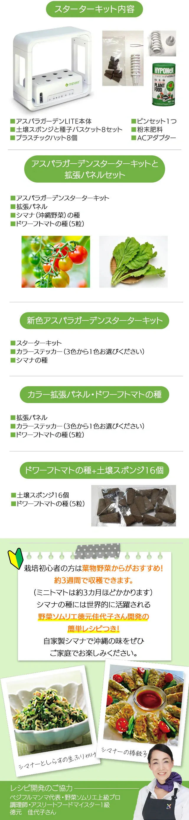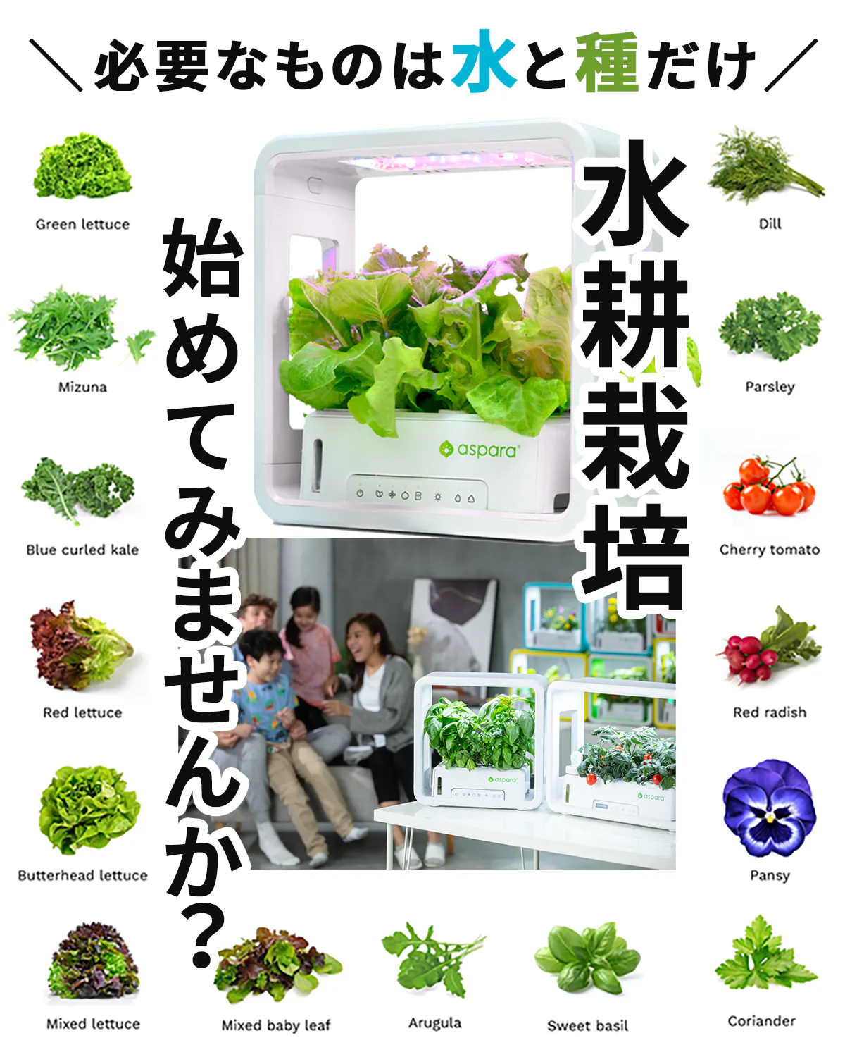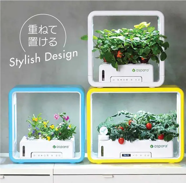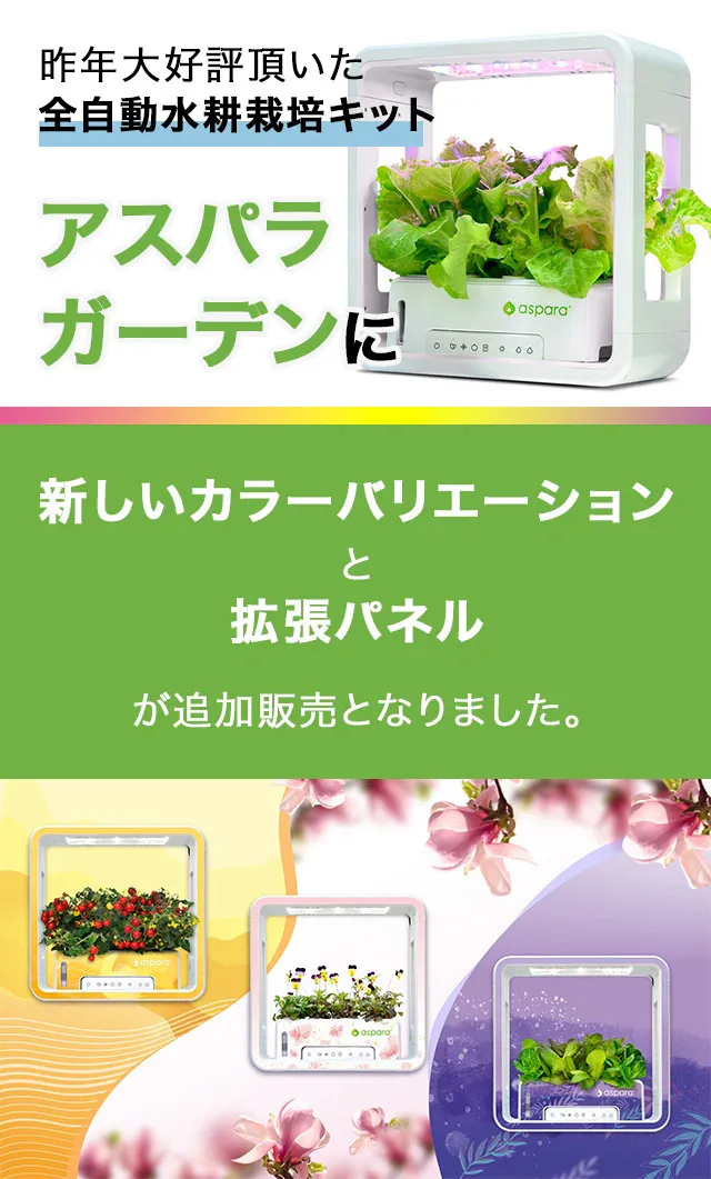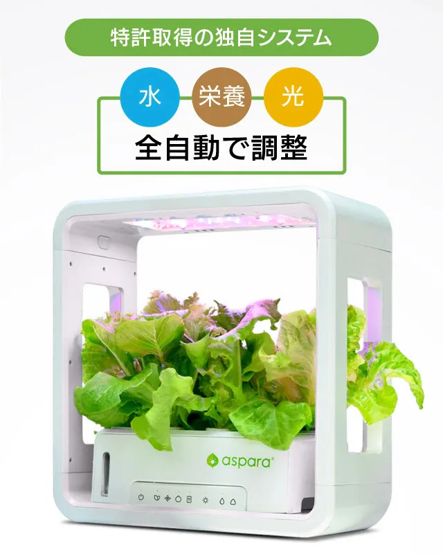 「アスパラガーデンLITE」は誰でもどこでも簡単に、室内で種から野菜やハーブ、お花を育てることができる 室内用水耕栽培キットです。