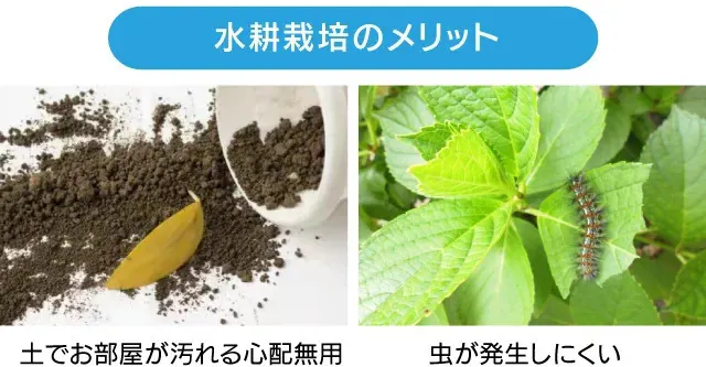気候や天候に左右されず、従来の土壌栽培よりも少ない水でより早く育てることができます。土を使用しないということは、害虫が発生しにくい、というメリットがあります。殺虫剤や農薬に頼ることなく育てられるので、無農薬野菜を育てることが可能です。