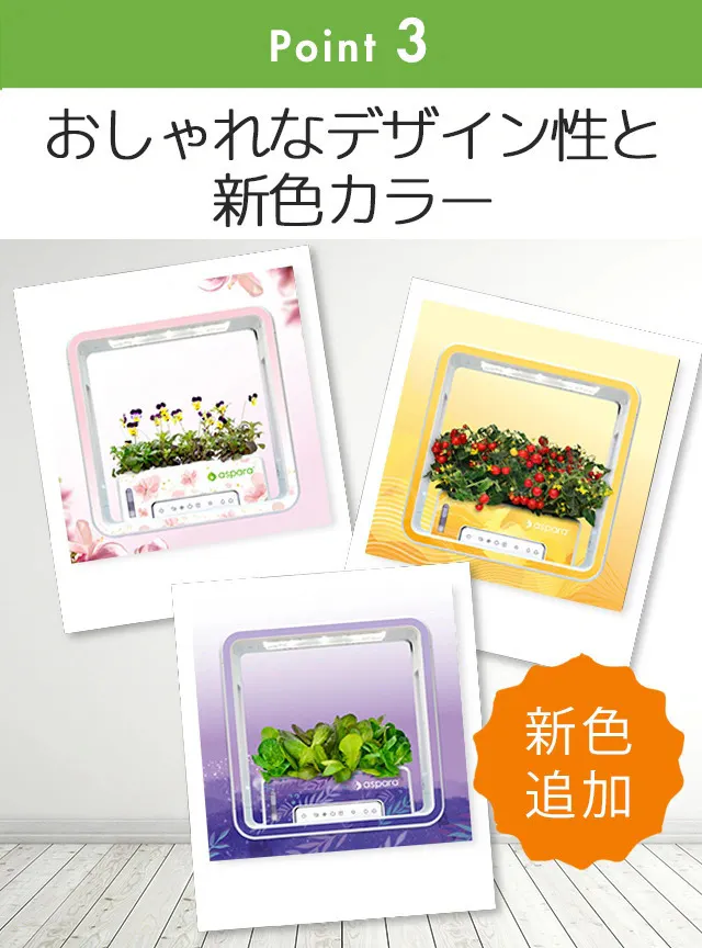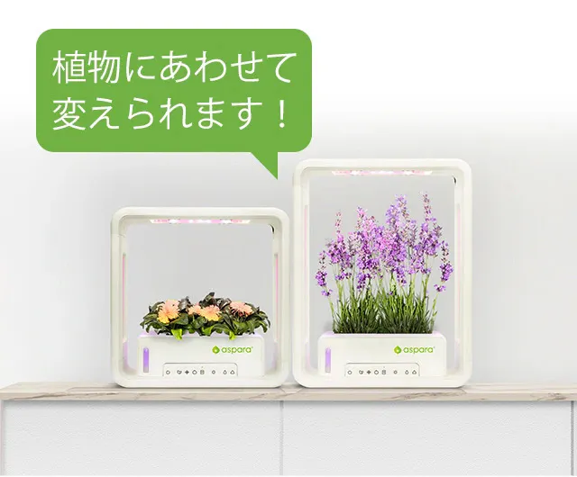 A:植物育成に必要な光は可視光線である赤色620-680nm(光合成を促す効果)と青色395-485nm(葉や実を大きく形成する効果)の光です。植物育成ライトで太陽光の代わりになり、植物の育成を促すことができます。アスパラガーデンは植物の種類ごとにこのライトの配色を変えることができます。