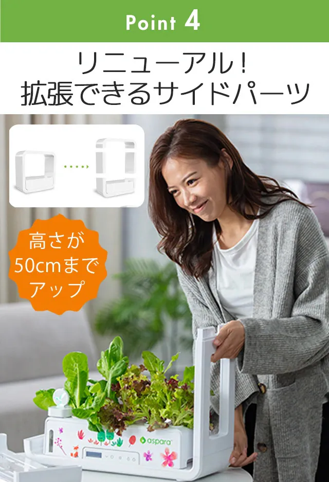 サイドパーツを拡張パネルに差し替えると縦のサイズアップ。ミニトマトやエンドウ豆など高さがある植物におすすめです!
