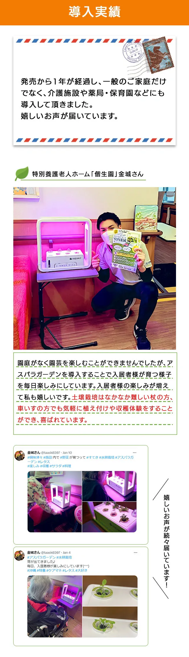 昨年、アスパラガーデン第1弾をMakuakeで挑戦し、その後は公式サイトを立ち上げ、ネット販売だけでなく、東京ギフトショーや介護事業者様向けの展示会「CareTEX大阪」に出展するなど、アスパラガーデンを日本で広めるために努力しています。
