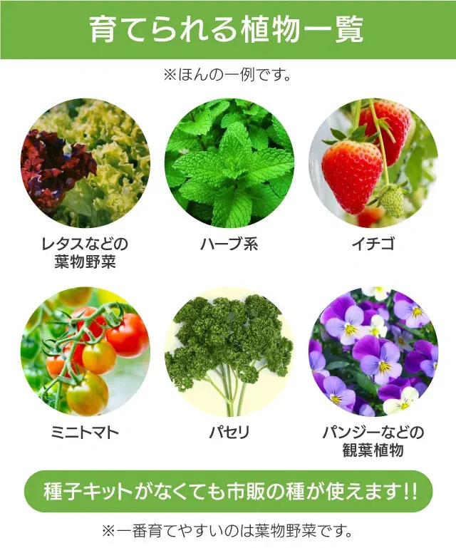 <その他>とうがらし、大葉、小松菜、サラダ菜、春菊、水菜、ほうれん草、ブロッコリースプラウト、ルッコラ、豆苗、パクチー、ローズマリー、イタリアンパセリ、クレソン、ミント、ディル、わさび菜、ラズベリー、ラディッシュなどさまざまな植物が育てられます。