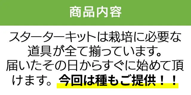 必要なものは水と、お好きな種だけ。 スターターキットには必要な土壌となるスポンジ、粉肥料などすべて入っています。