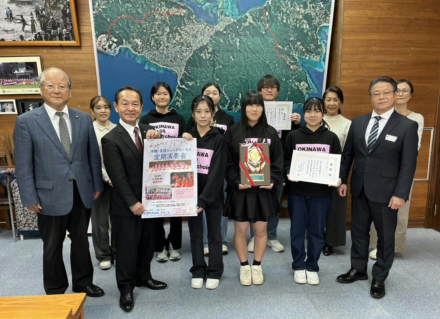 昨日は市長室を訪ね、渡具地武豊名護市長と岸本敏孝教育長に、県アンコン金賞・グランプリ受賞と全国大会への出場の報告とあわせて、20日(水)に開催する定期演奏会についてのお知らせをしてきました。