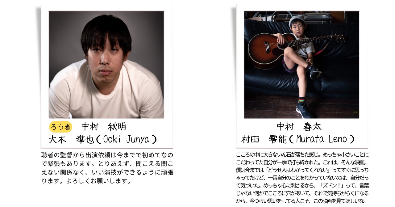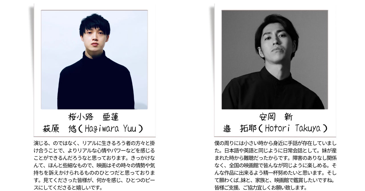 この映画は、聴者とろう者(耳が聴こえない)の役者達が、切磋琢磨し一緒に作品を作り上げるというチャレンジ精神に溢れたメンバーで構成されています。