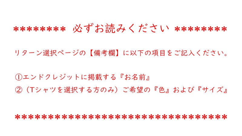 ご支援いただいた皆さまには 支援金額に関わらず、映画本編でのエンドクレジットにお名前を掲載させていただきます(※ご希望の方のみ、ニックネーム掲載可能です)