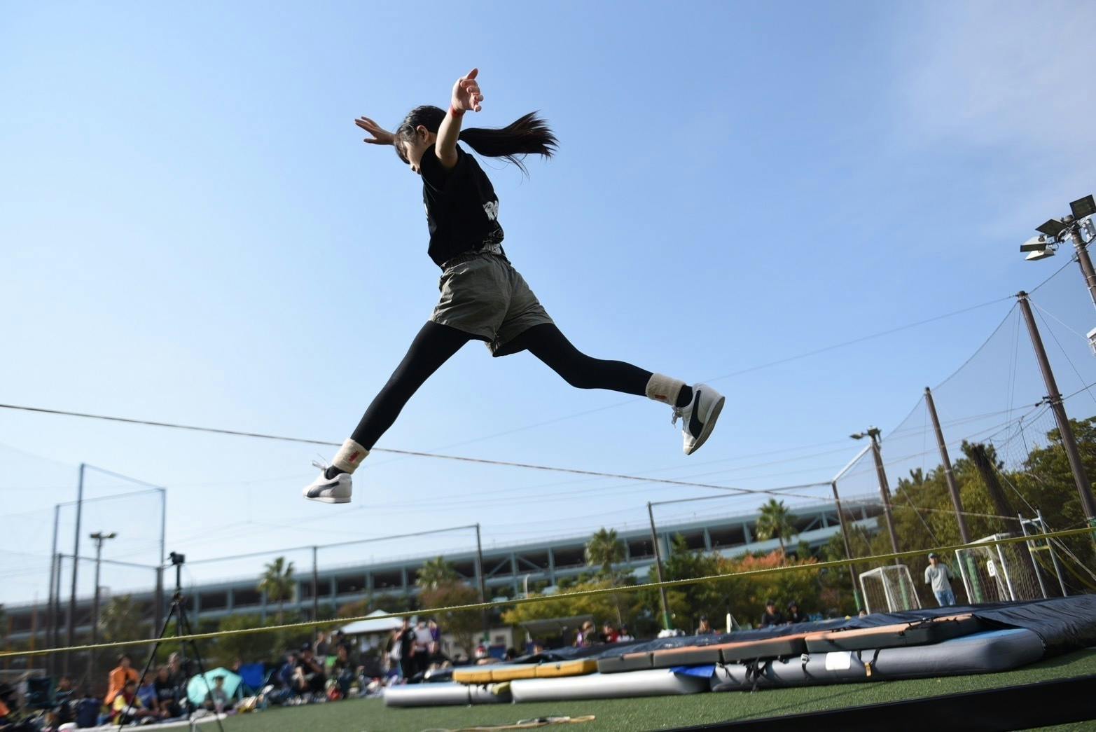 ※スラックラインとは、ベルト状のラインの上を歩いたり、飛んだり跳ねたりするスポーツです。