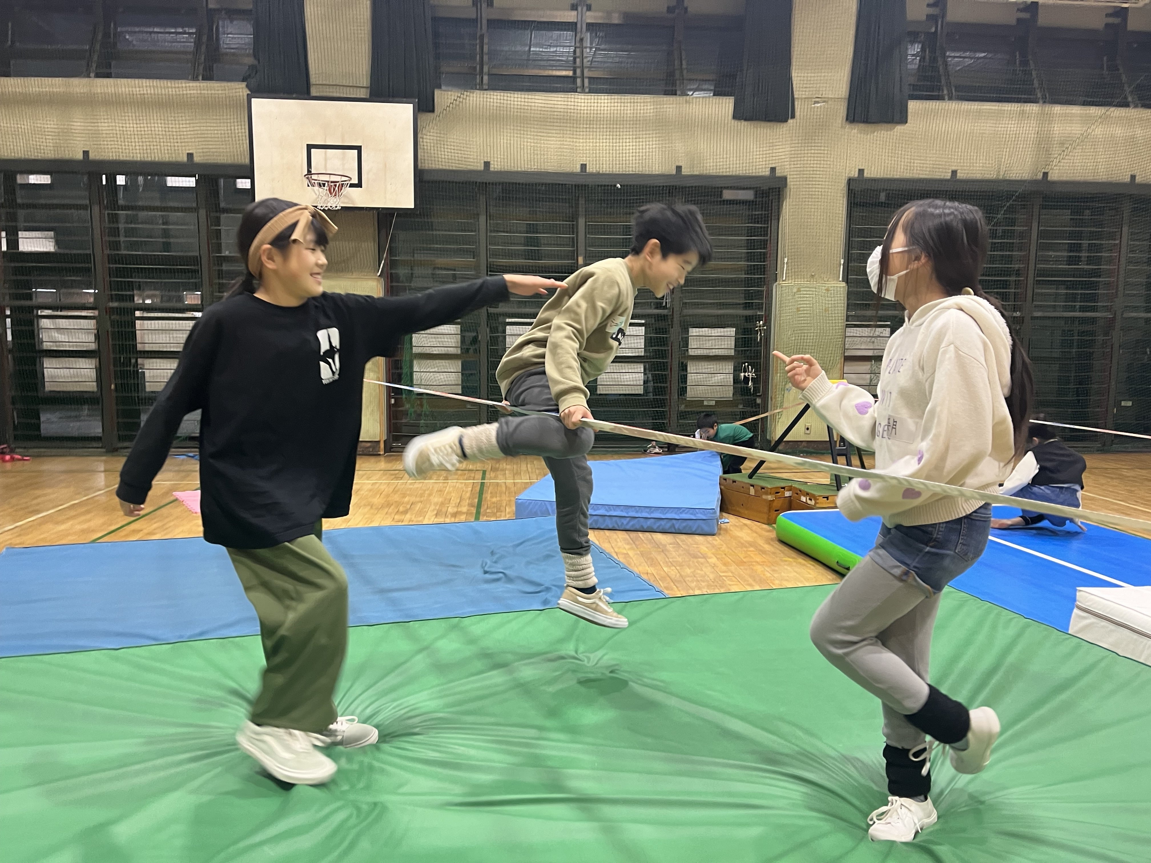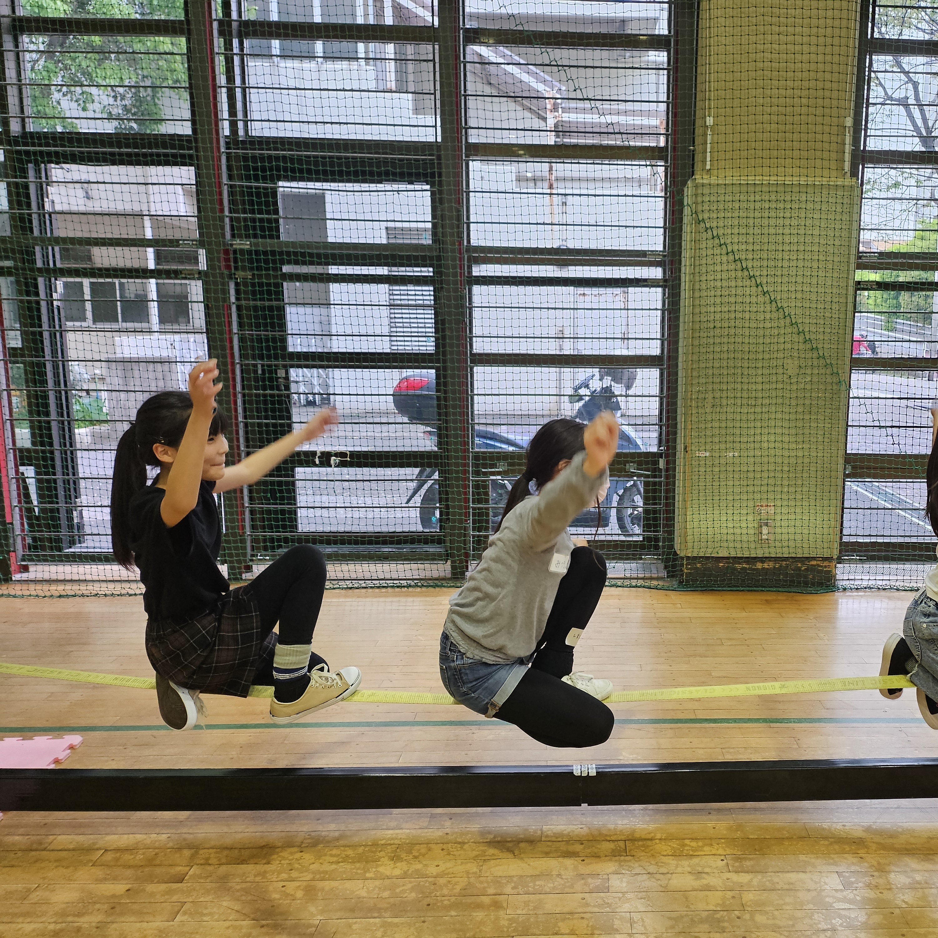 品川区の児童センターでスラックラインの講習会がある日に各自参加して練習をしています。