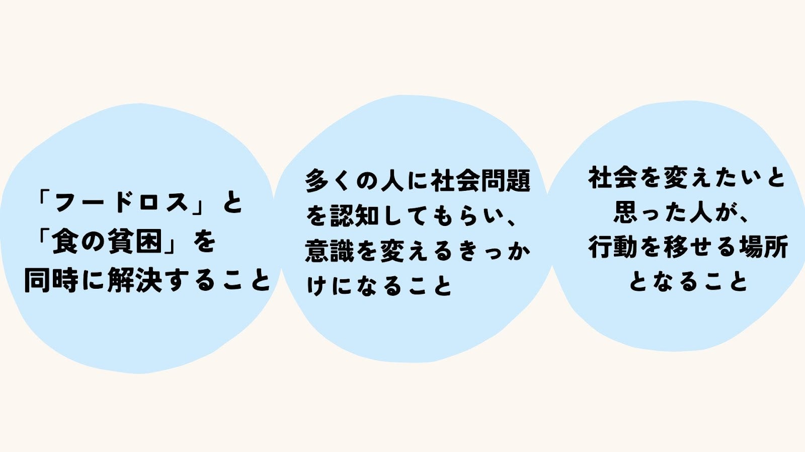 ①にはターゲットとする2つの社会問題を解決することを最終目標として、②にあまいろ商店の活動を通してより社会問題を自分ゴトとしてとらえるきっかけをつくり、普段の当たり前の中に気付きを与える存在になりたい、そして③に社会問題を知った方たちが問題解決のために何かをしたいと思った時に気軽に行動できる場所をつくりたい、ということが背景としてあります。