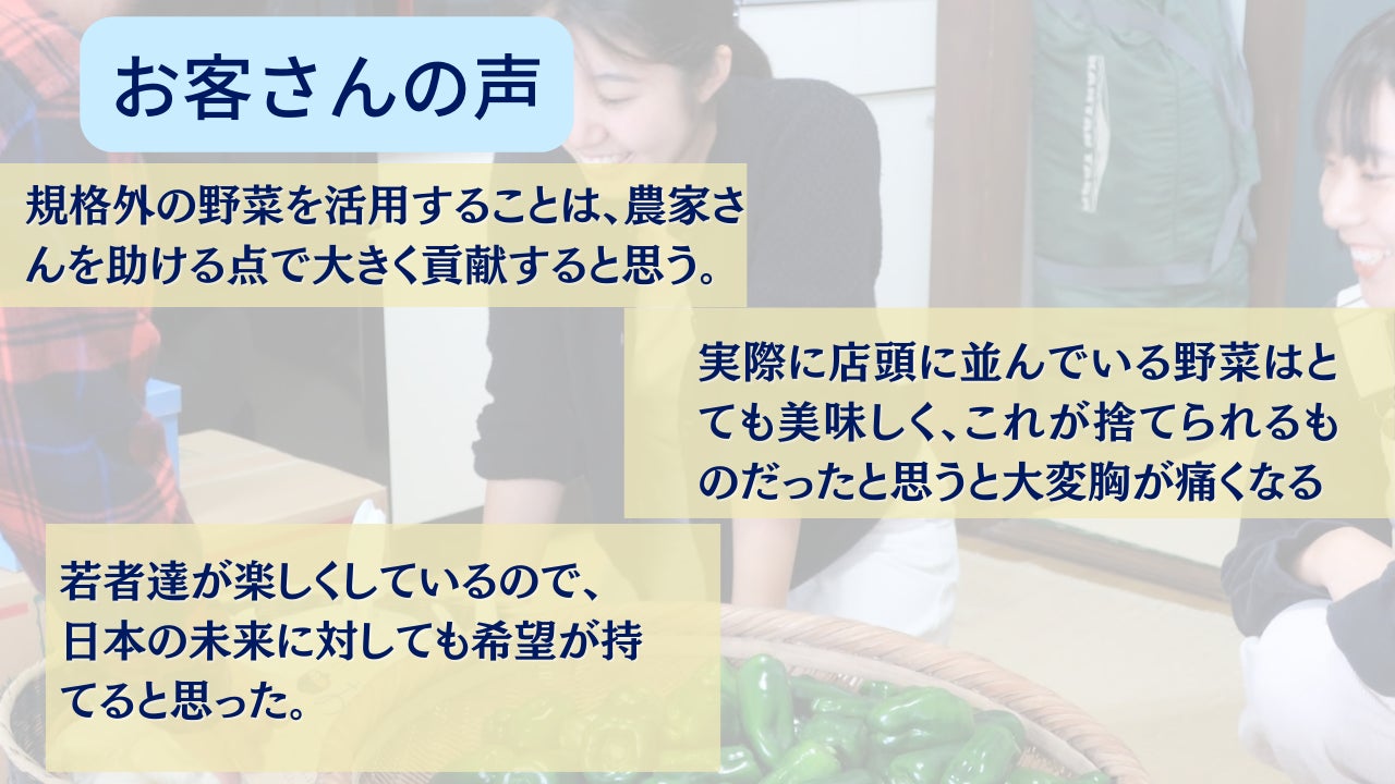 実はそれらの農産物、味には全く問題ないのに規格外や傷入り、採れ過ぎなどの理由により廃棄されたものだったのです。食べものを作る大変さを感じていた代表は、まだ食べられるものが捨てられてしまうことにもったいなさを感じていました。