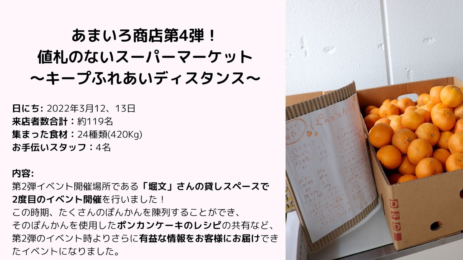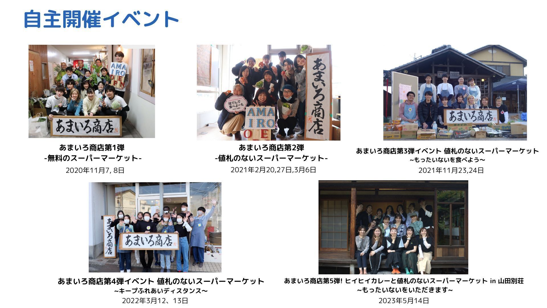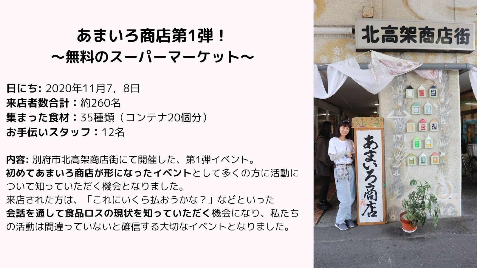 「貧困問題」「食料廃棄問題」の社会問題は他人事ではなく、思っている以上に私たちにとって身近な存在です。当事者だからこそ、一人一人の意識が変わればもっと明るい世の中に出来るかもしれません。あまいろ商店はそれに気づくきっかけとなる存在になりたい。「値札のないスーパーマーケット」の活動を通して、日本にも存在する社会問題をもっと多くの方に身近に感じてもらいたいと思っています。