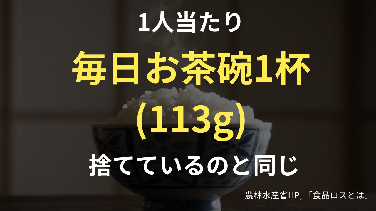 これは国民一人当たりに換算をすると、毎日お茶碗一杯分のご飯(約113g)を捨てているのと同じ量になります。(農林水産省HP, 「食品ロスとは」)