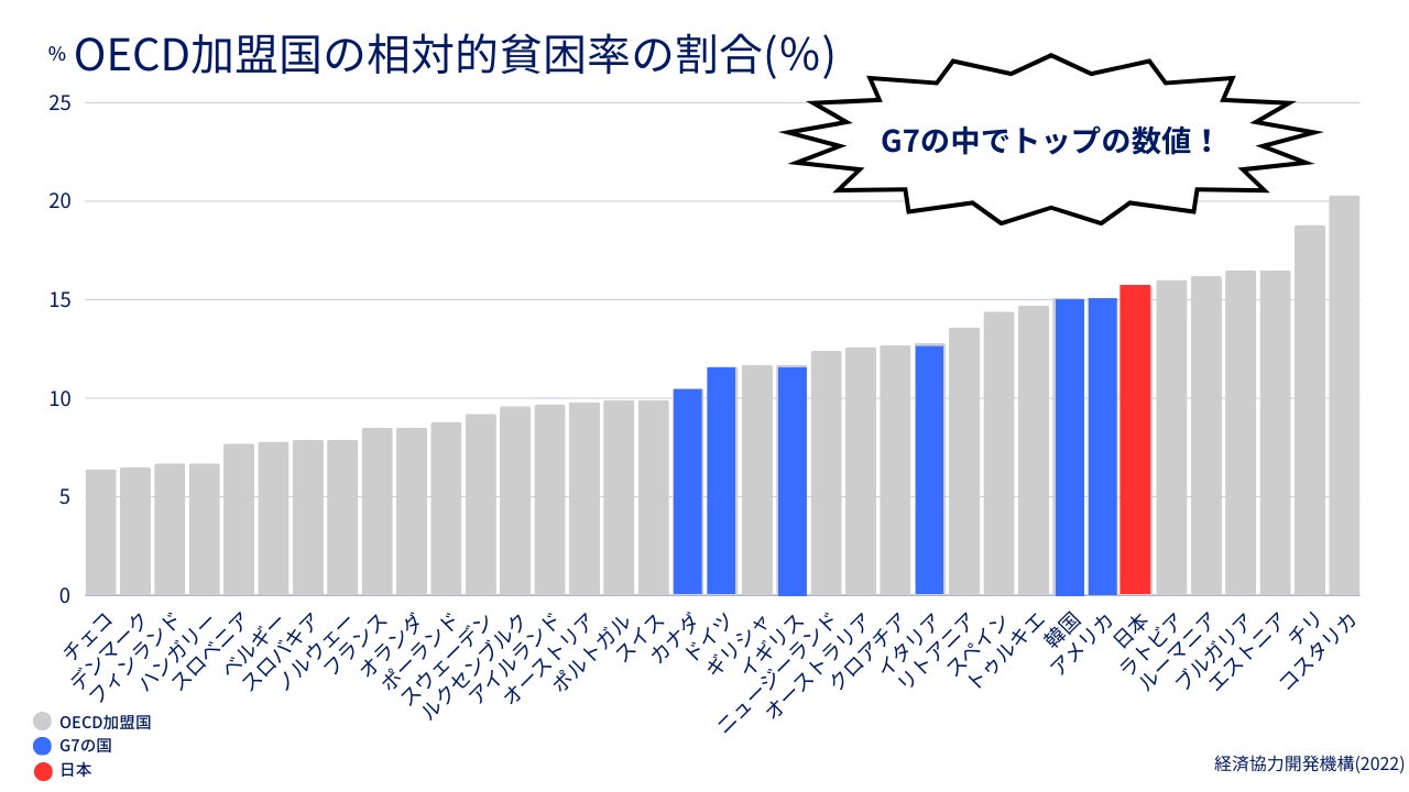 OECD(経済協力開発機構)の加盟38カ国の相対的貧困率ランキングによると、最も貧困率が高い国は中米のコスタリカ(20.3%)です。また、日本は7位(15.7%)であり、G7(主要7カ国)のなかでは最も貧困率が高い結果となっています(経済協力開発機構、2022)。