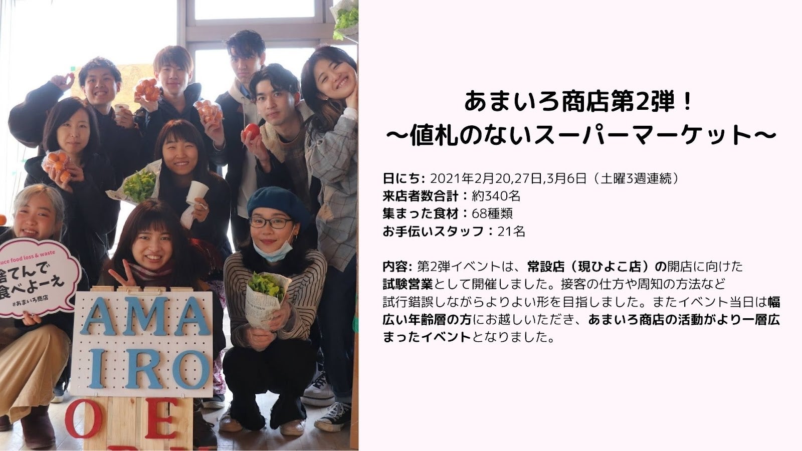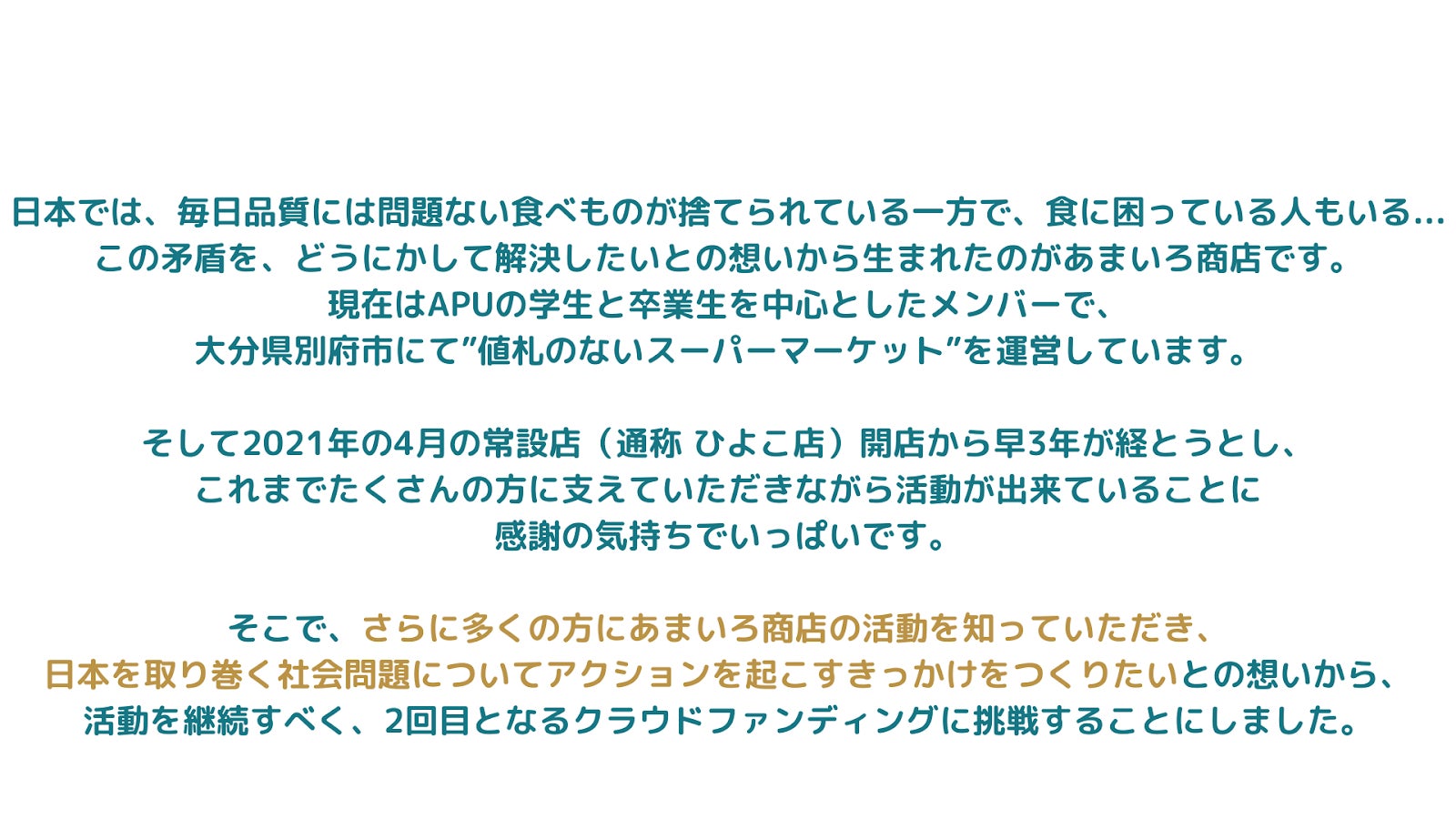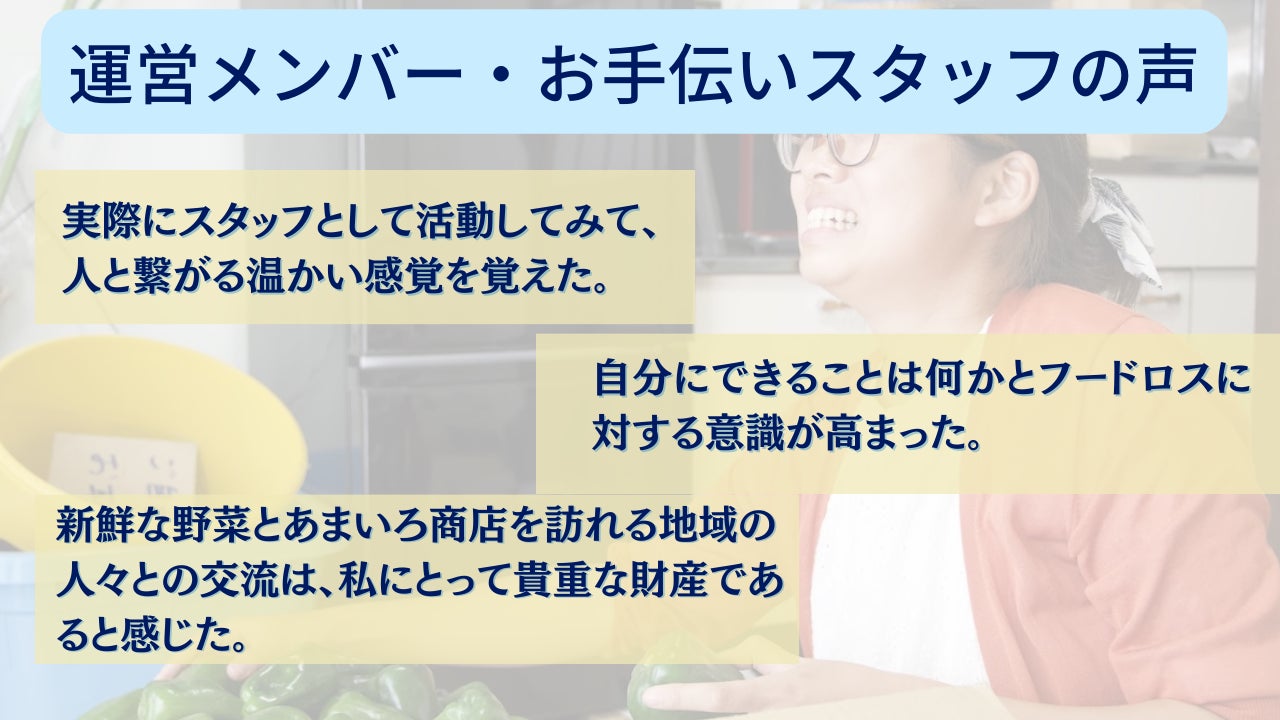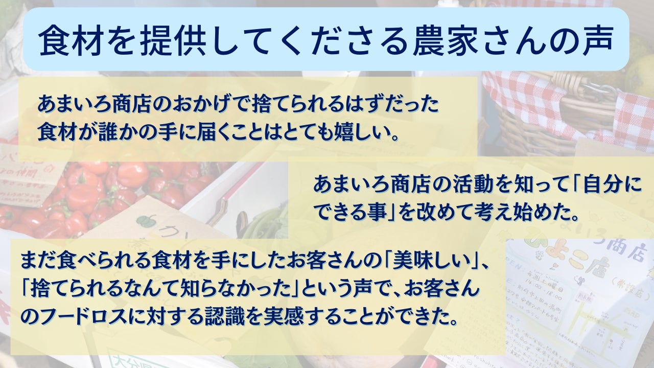 「貧困問題」「食料廃棄問題」の社会問題は他人事ではなく、思っている以上に私たちにとって身近な存在です。当事者だからこそ、一人一人の意識が変わればもっと明るい世の中に出来るかもしれません。あまいろ商店はそれに気づくきっかけとなる存在になりたい。「値札のないスーパーマーケット」の活動を通して、日本にも存在する社会問題をもっと多くの方に身近に感じてもらいたいと思っています。