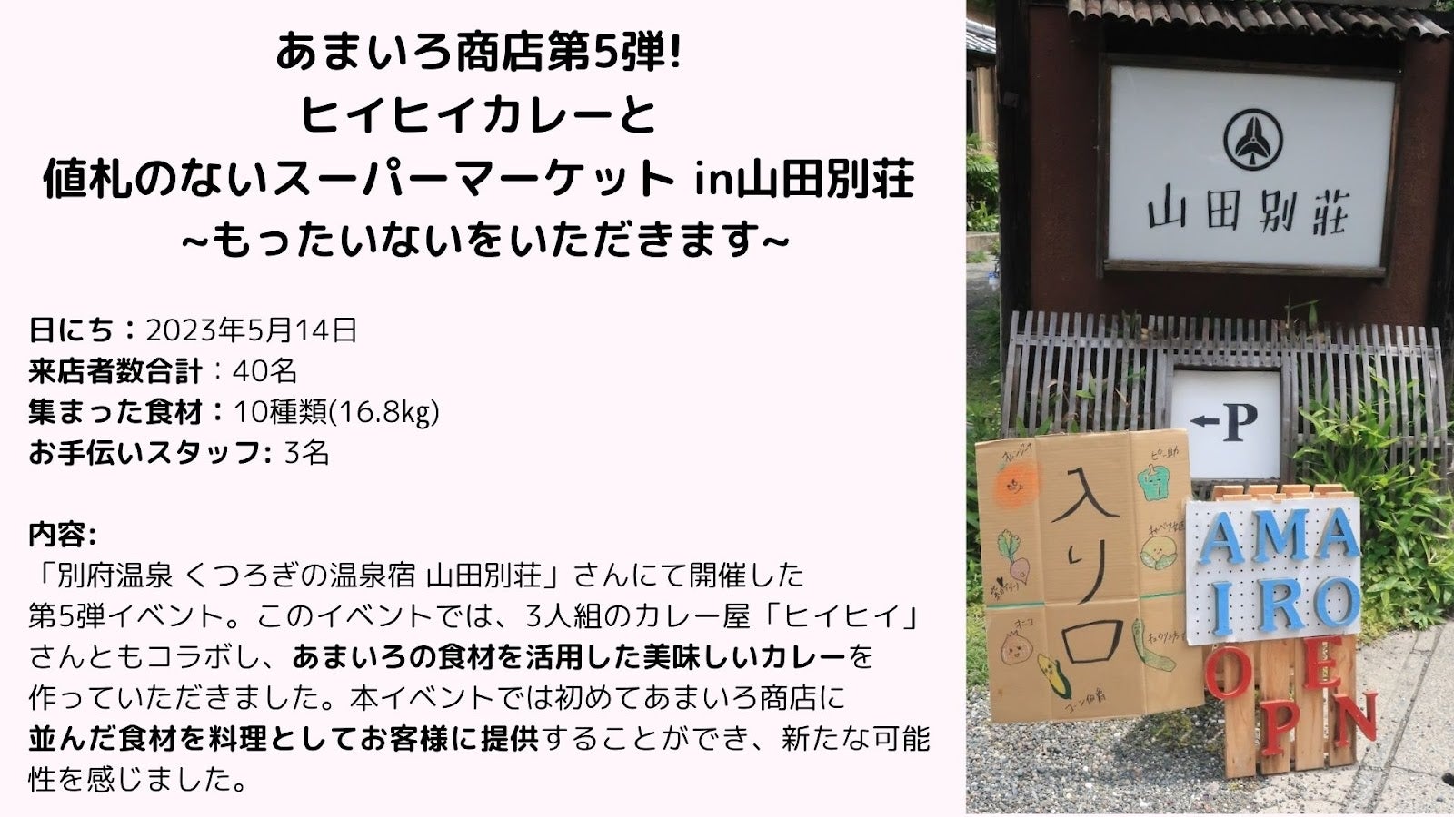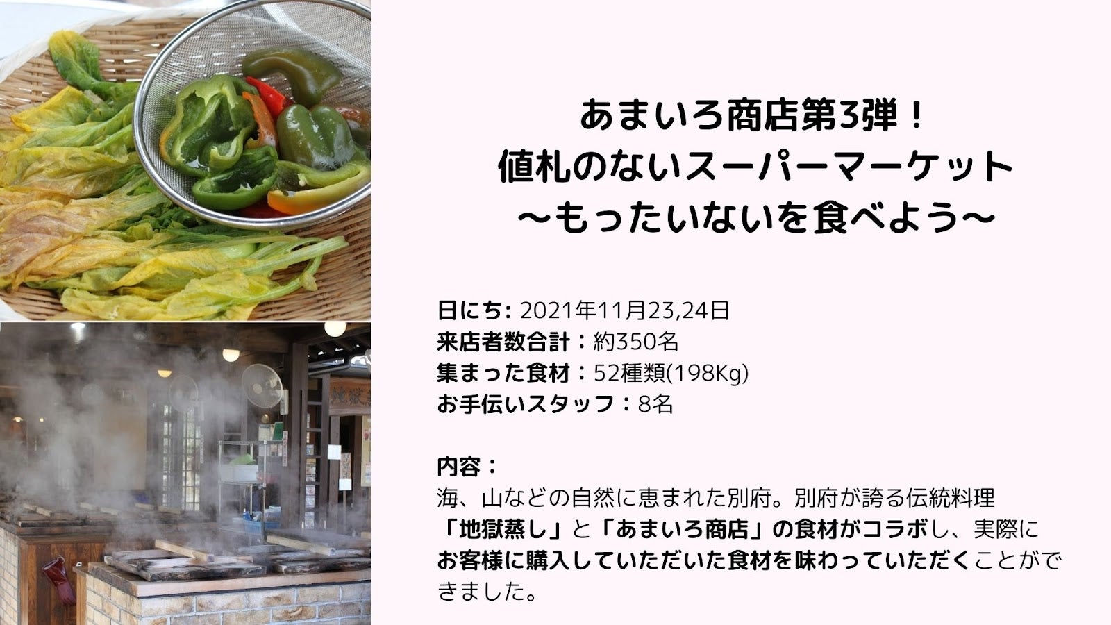 私たちは、別府市で「値札のないスーパーマーケット」を運営しているあまいろ商店です。当ページを訪れていただきありがとうございます。