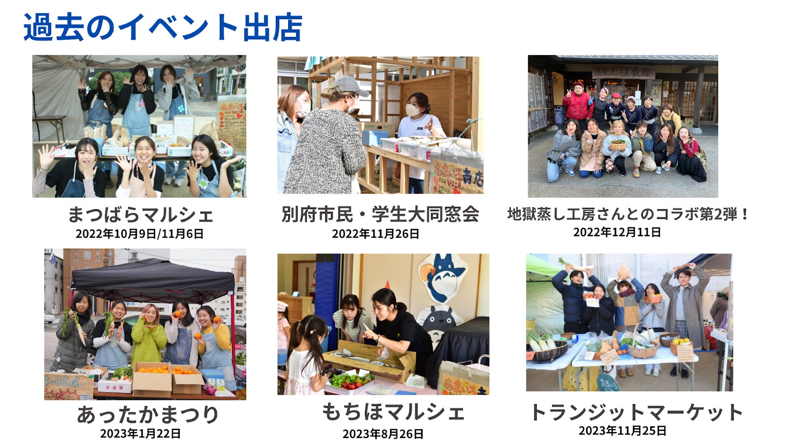 今までに別府市内を中心に計10回のイベントに出店してきました。マルシェへの出店のほか、立命館アジア太平洋大学学園祭へのブース出展、飲食店や保育園とのコラボイベントなどを実施。地域の方との交流を大事にし、イベントへの出店を通して様々な方とつながる機会となっています!