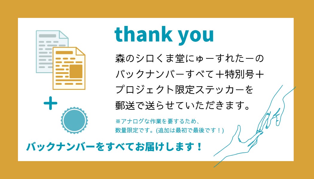「にゅーすれたー。バックナンバーセット」を追加してほしい!とのご要望をいただいたため、リターンを追加させていただきました。