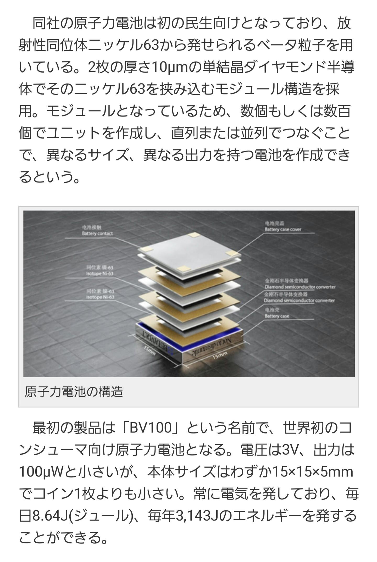 先日、投入されれば、さまざまな社会変革が起きるある記事に目が釘付けになりました。中国の新興企業「ベータボルト・テクノロジー社」は、民生向けとしては初めての、「原子力電池」の開発に成功したと発表しました。2025年には、1Wの製品を予定しており、「永遠に充電する必要がないスマートフォン」、「永遠に飛び続けられるドローン」も実現できるとしている。(電欠の心配から解放される)