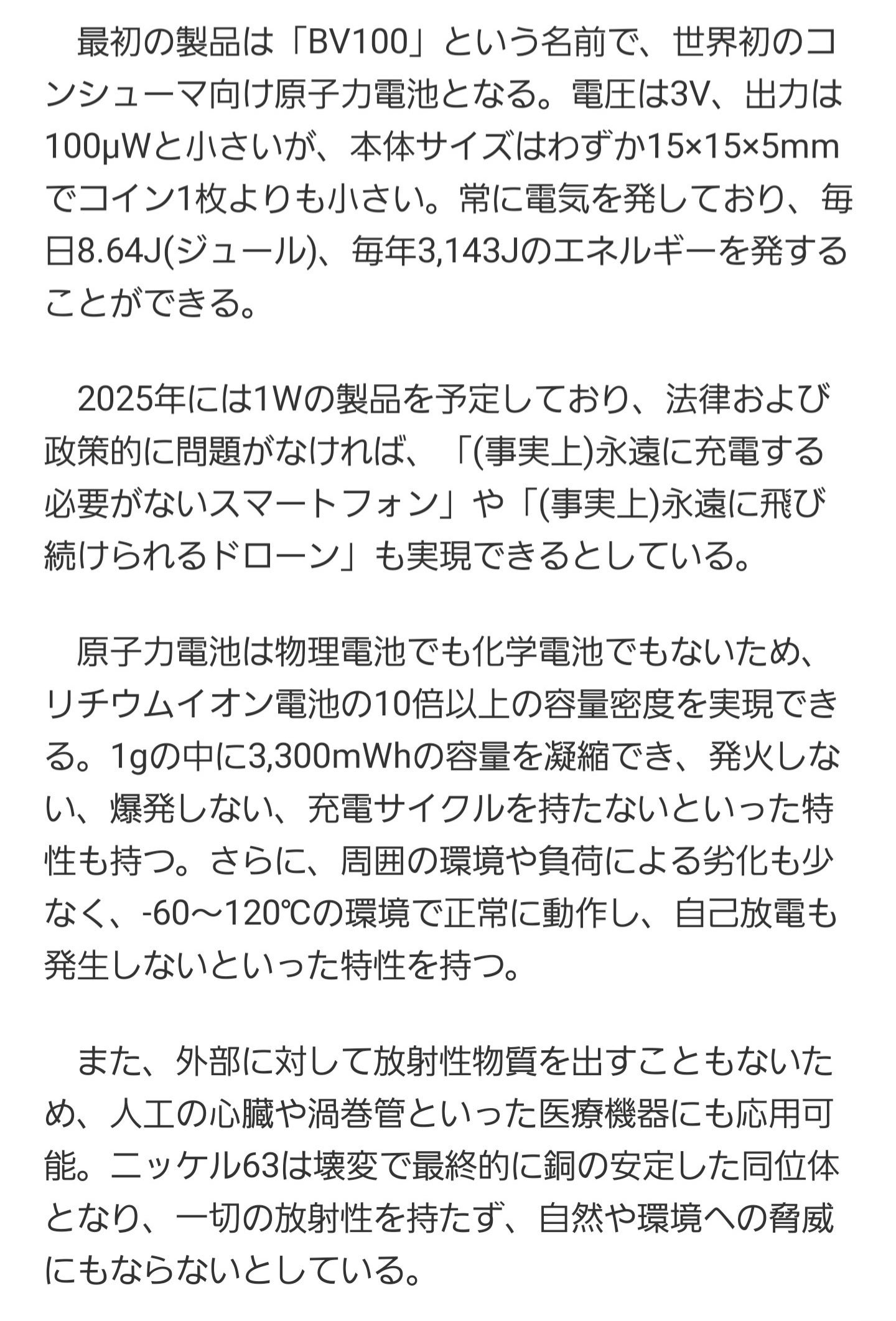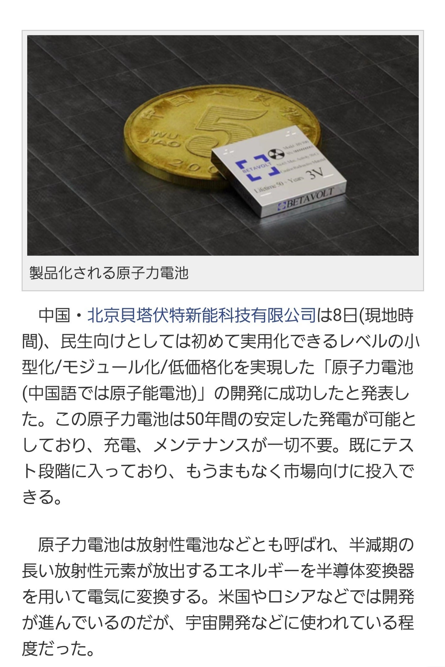 先日、投入されれば、さまざまな社会変革が起きるある記事に目が釘付けになりました。中国の新興企業「ベータボルト・テクノロジー社」は、民生向けとしては初めての、「原子力電池」の開発に成功したと発表しました。2025年には、1Wの製品を予定しており、「永遠に充電する必要がないスマートフォン」、「永遠に飛び続けられるドローン」も実現できるとしている。(電欠の心配から解放される)