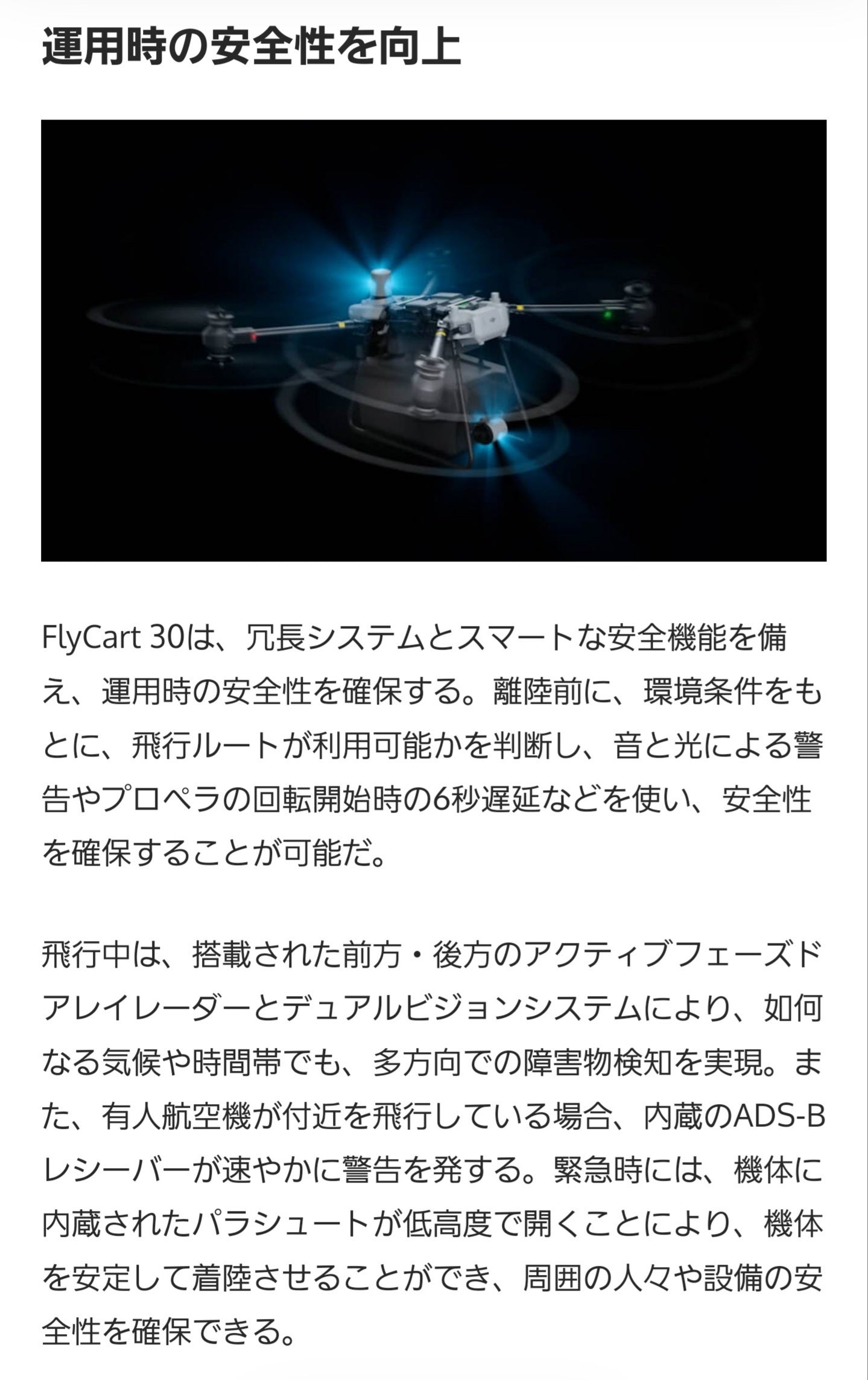 この大型長距離輸送ドローンは、非常に高性能、高機能な機体で、これまでにない様々な安全対策が施されています。その一部として、前方、後方に搭載された、フェーズド アレイレーダーにより、いかなる気候、時間帯でも多方向の障害物を検知します。そして、万が一の緊急時に備えて、機体に内蔵されたパラシュートが低高度で展開することにより、周囲の人々、設備の安全性を確保します。またウィンチモードでは、自動で機体の姿勢を制御し、貨物の揺れを最小限に抑え、機体自体を着陸させることなく、ウィンチシステムにより、手動または自動で、支援物資等の、切り離し、吊り上げが可能。また、吊り荷が引っかかったり、絡まったりするような極端な状況下では、ウィンチケーブルを加熱して、切断し、ドローンを解放することが可能です。