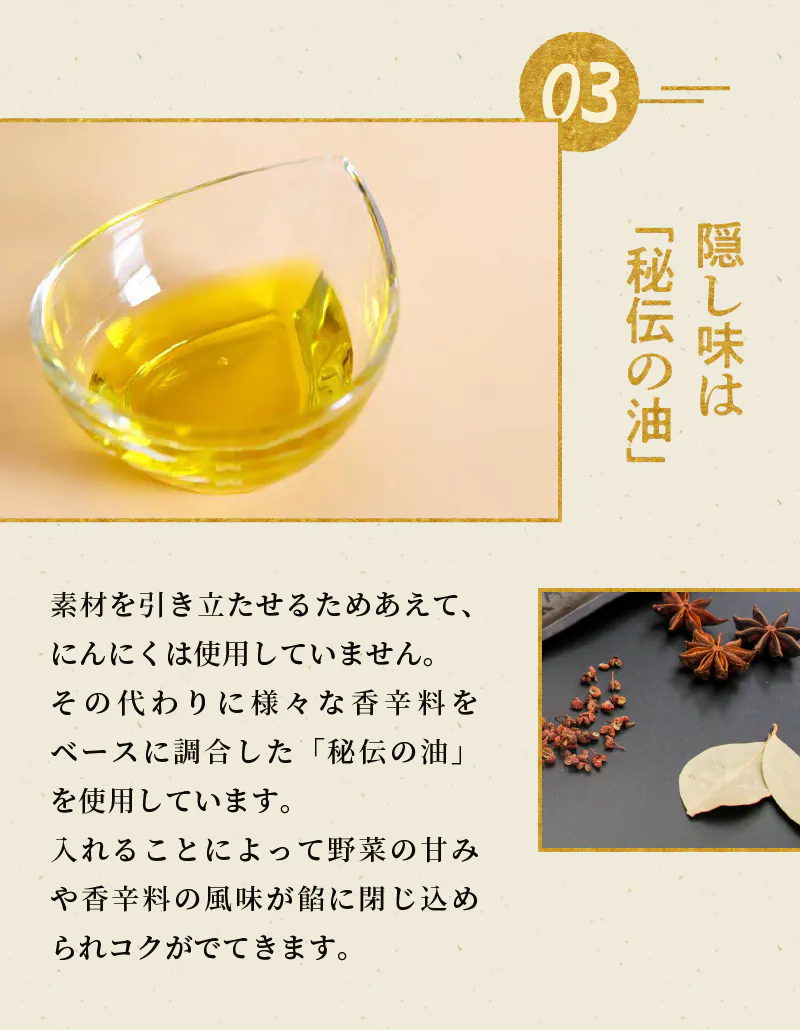 【原材料】:豚肉(国産)、小麦粉、豚骨スープ(豚背骨、豚皮、豚足、鶏ガラ)、ネギ、生姜、サラダ油、オイスターソース、醤油、ごま油、塩胡椒、砂糖