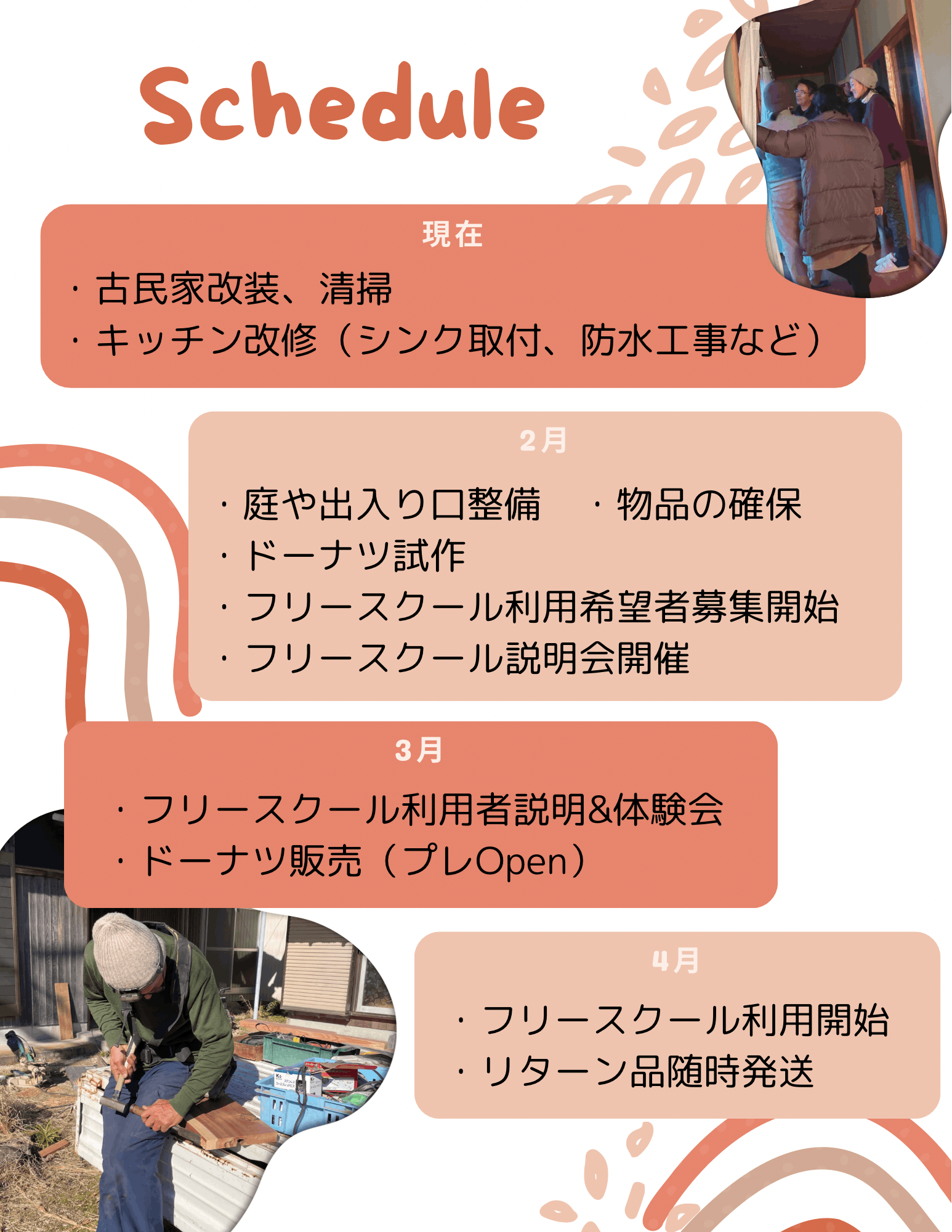 準備が整い次第、フリースクールの利用者を募り、場所の見学や説明会等を進め4月からの始動を予定しています。(3/7・8説明会予定)