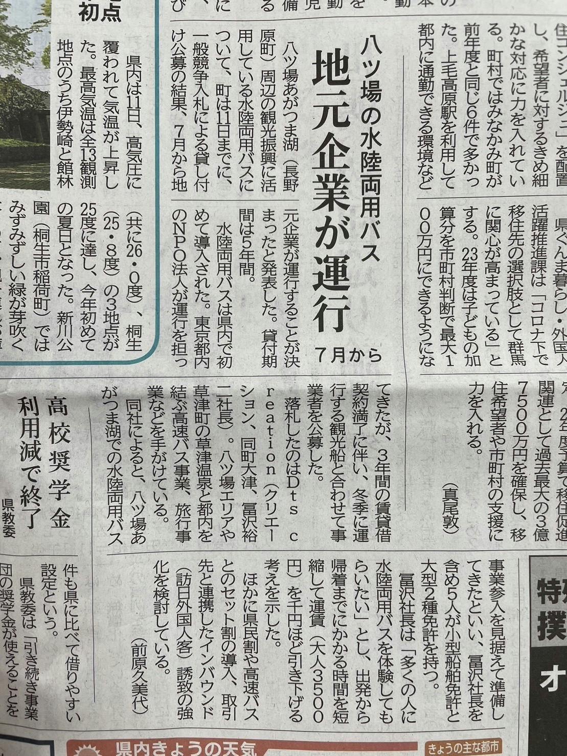 その想いの元、私たちはこれまでにも「池袋ー草津」間を結ぶ高速バス事業、「埼玉県八瀬市ー八ッ場・草津温泉」を結ぶDts line八ッ場・草津温泉号を運行してきました。直近では、八ッ場あがつま湖周辺の観光振興のために八ッ場水陸両用バスの運行を開始し、長野原町の子供たちに居場所を残してあげられるように、長野原町全体が盛り上がっていくように、努めてきました。
