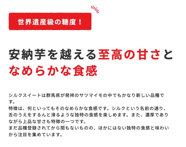 ・創業当初より大切に育ててきた群馬県が発祥のサツマイモ (シルクスイート )をお届けします。