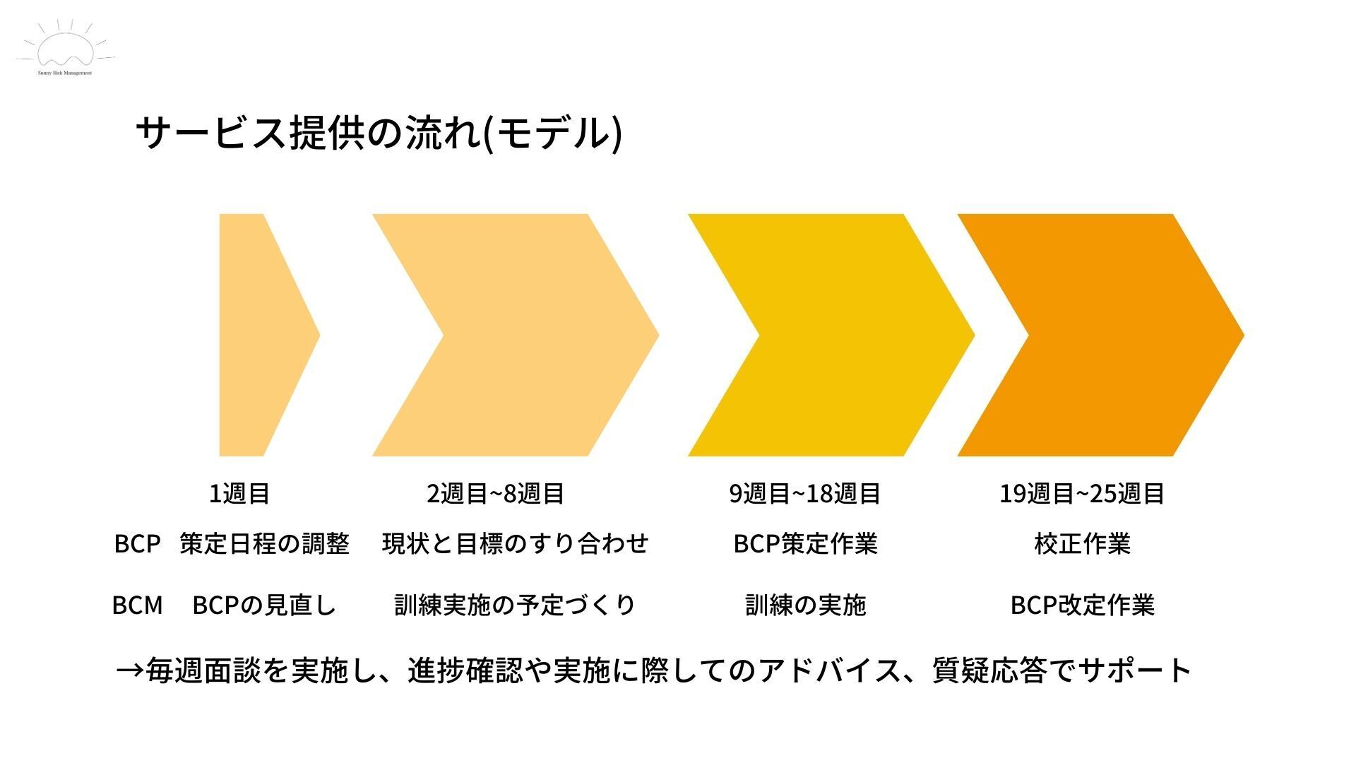 サニーリスクマネジメントでは、BCPの策定に関して、①策定日程の調整→②現状と目標のすり合わせ→③策定作業→④校正という流れをとっています。