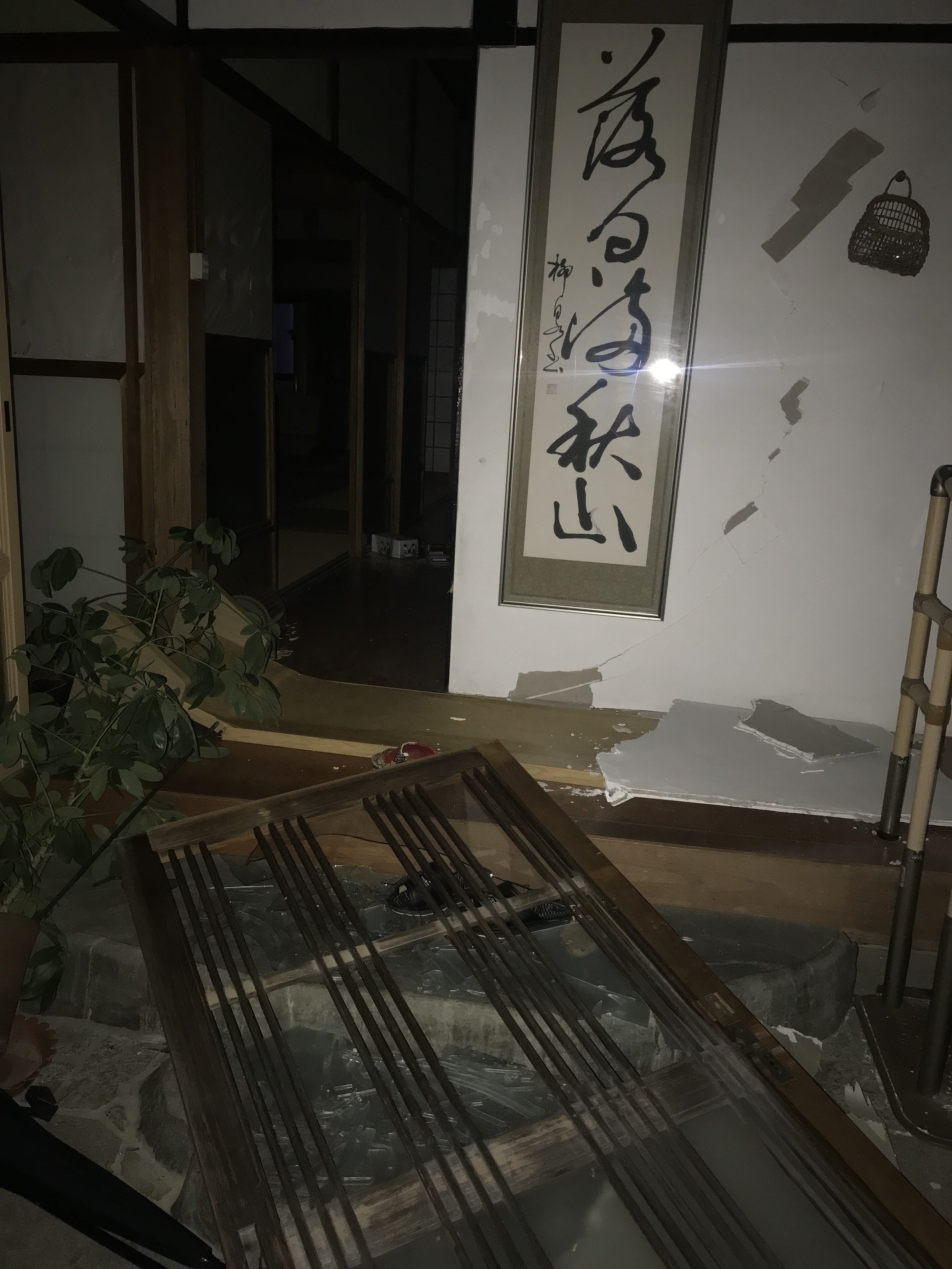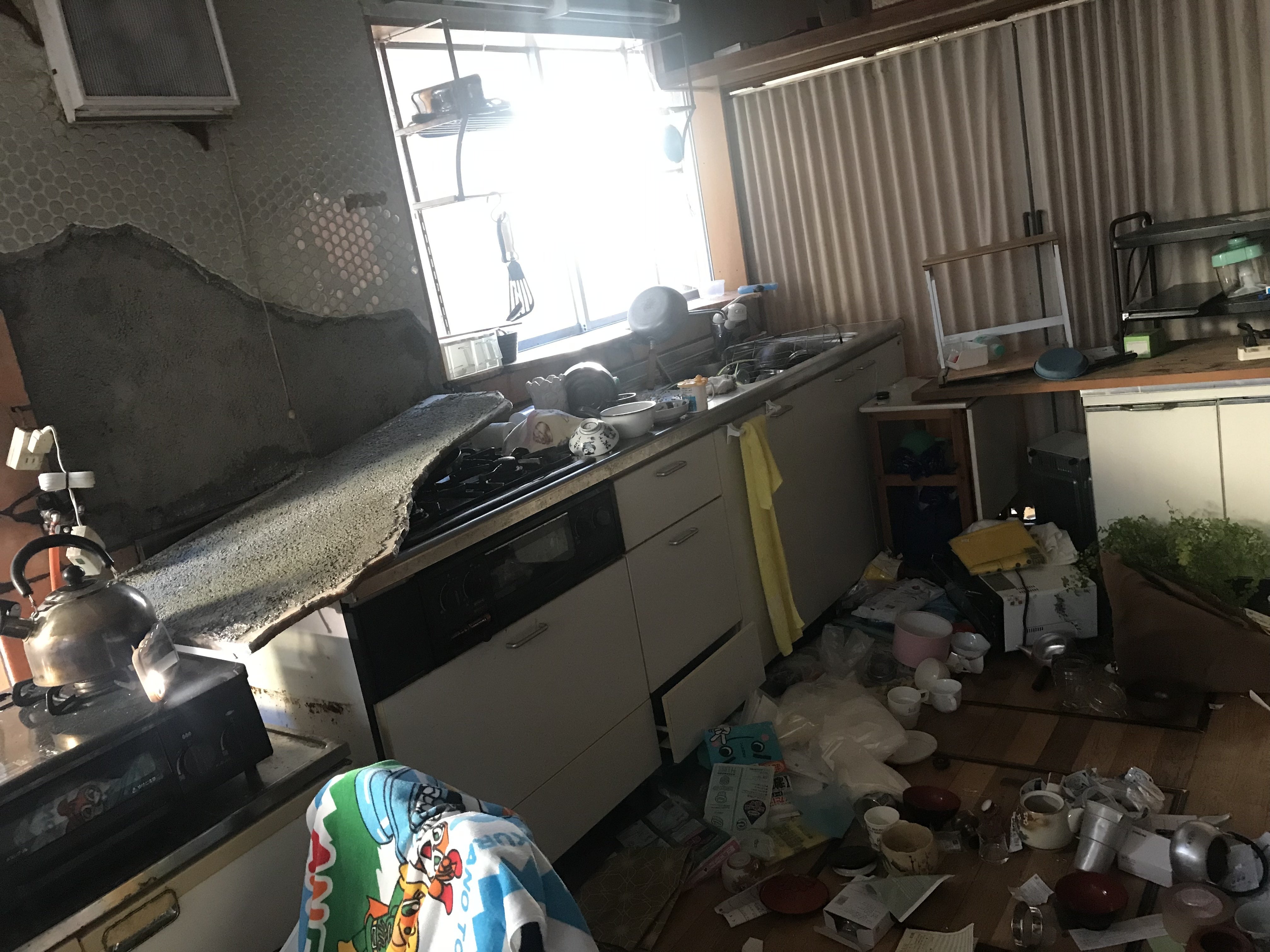 菓子店オープン予定の建物は、外壁内壁ともに剥がれた部分が多く、窓ガラスの9割が割れて雨晒し状態であるのが現状であります。準備していた設備や器具も、家具倒壊によりほぼ使えない現状です。