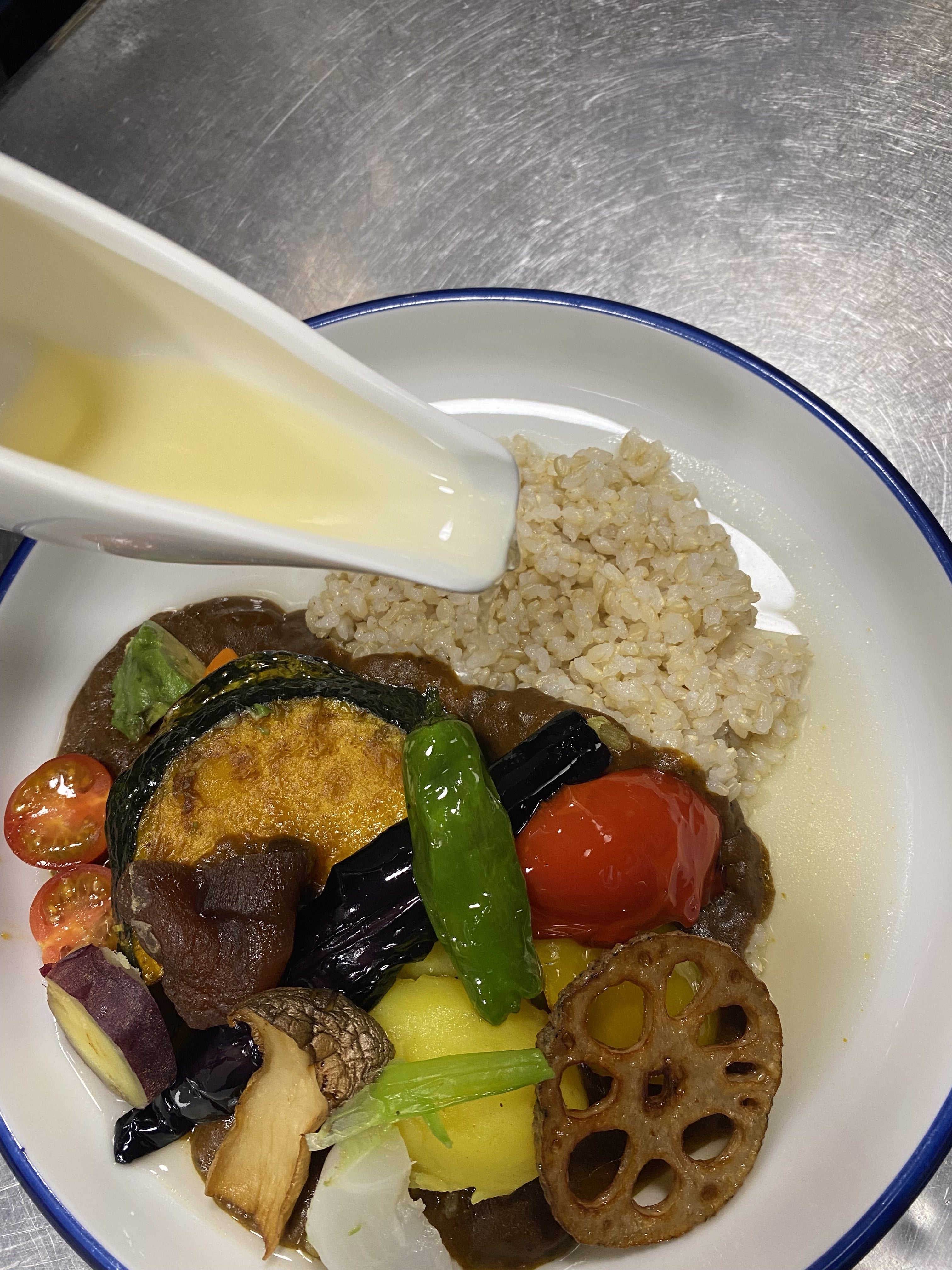 濃厚でドロドロのカレーをトリのスープでのばし、自分の好きな粘度にカスタマイズし、尚且つその事により風味が変わり、味変のような事ができるのが特徴です。