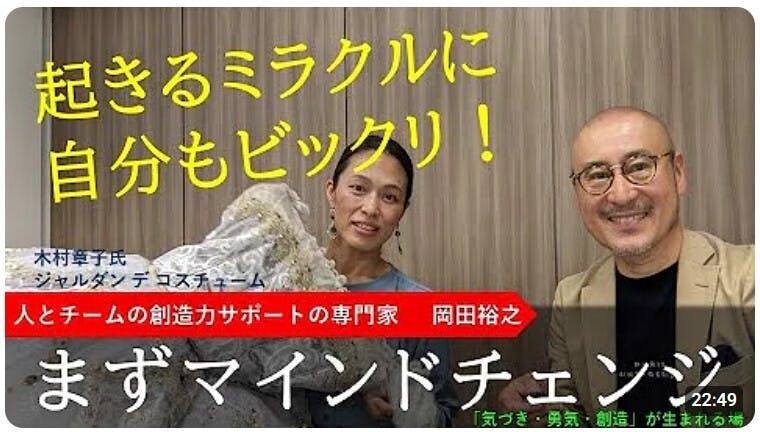 人とチームの創造力サポートの専門家 岡田裕之さん(ヴィ・ホライズン株式会社)と一緒に、「自分で動けば世界が変わる」ことを実感し、「チャンスの神様の前髪を掴んだ」瞬間のお話など、楽しい雰囲気で対談しています。