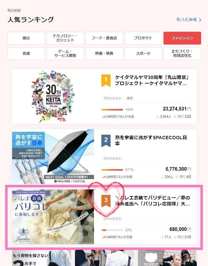 なんと、CAMPFIREのトップページ「人気ランキング」のファッションジャンルで、このプロジェクトが第3位にランクインしました~~~!!!