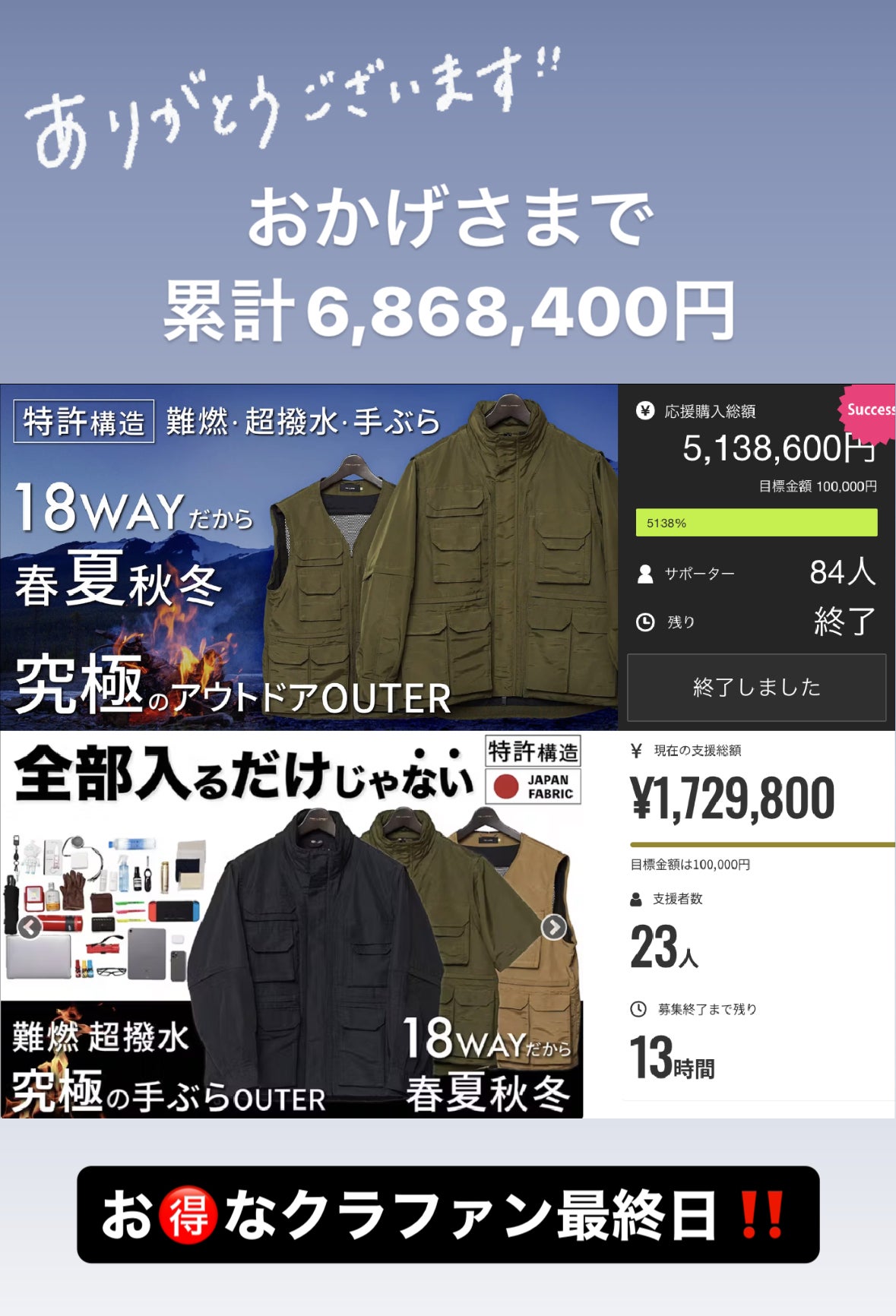 ご支援者の皆さまお世話になっております。RE:LORE™(リロア)の川端です。本日、「39着限定/ヴィンテージ×機能性/軽量・伸縮・超撥水・10ポケット手ぶらGジャンのクラファンがスタートしました。https://camp-fire.jp/projects/742056/viewFUNCTION & DESIGN FOR GOOD LIFE機能性とデザインで人々の生活を豊かにする。このコンセプトから生まれた全く新しい次世代のGジャン。『10 POCKETS JAPAN DENIM JACKET』きっと皆さまにクオリティにご満足いただき、機能性では日々の生活のお役に立てると期待しております。是非ご覧いただけますと幸いです。よろしくお願いいたします。RE:LORE™ 川端