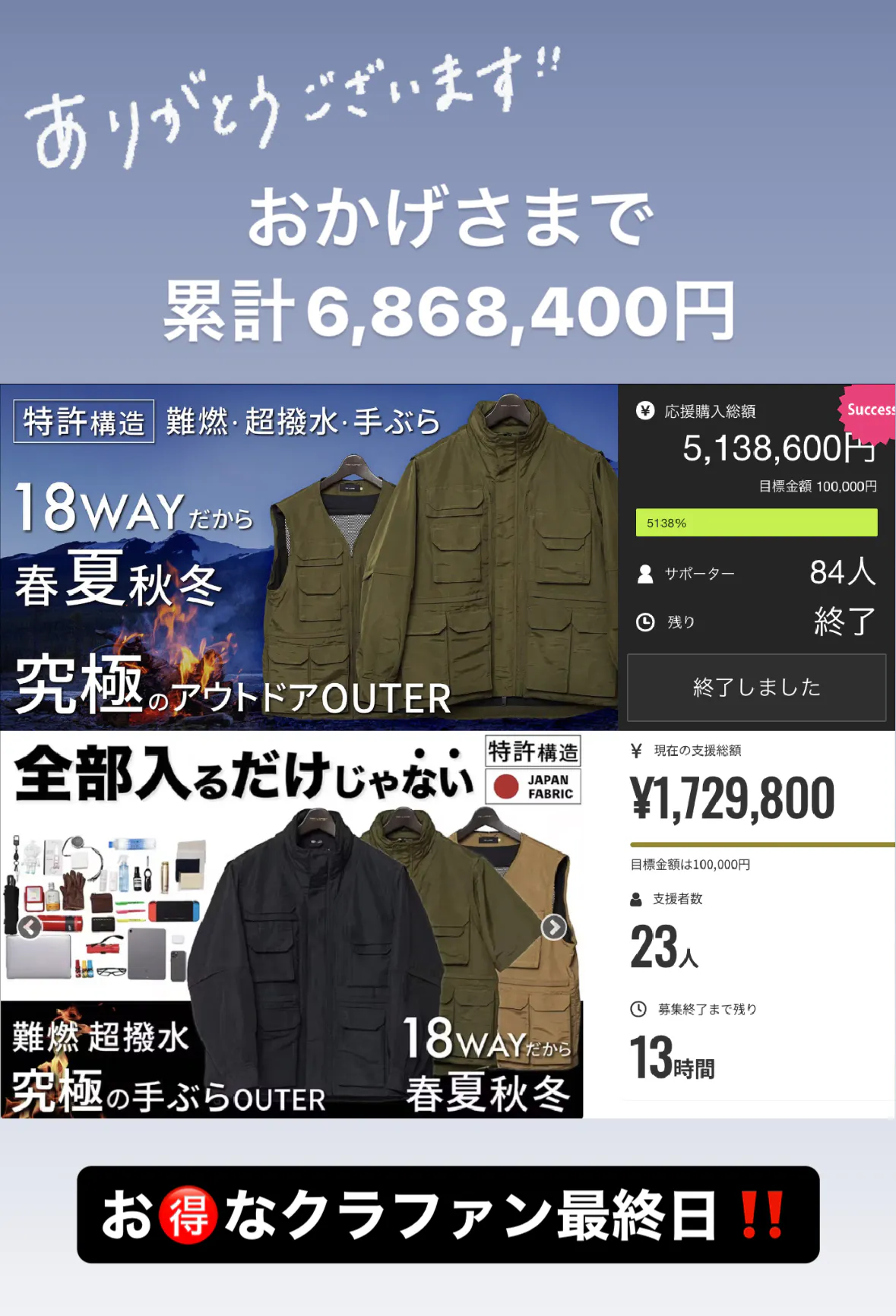 本日お得なクラファンの最終日となっております。