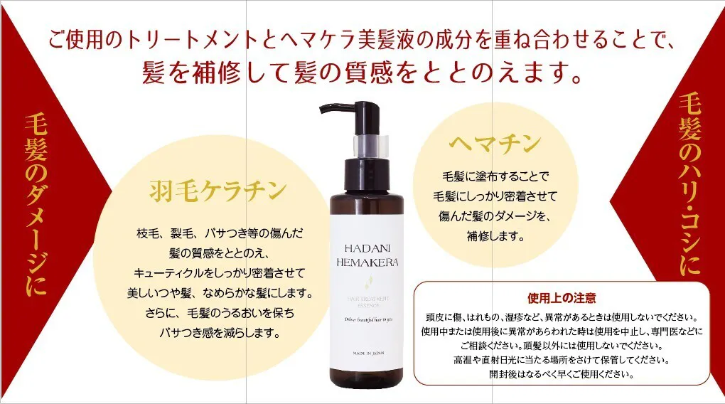 革新的な美容液「hemakera(ヘマケラ)」は、専門家が開発した「ヘマチン」と「羽毛ケラチン」の特別な配合で、自宅でサロン品質のトリートメントケアが可能です。