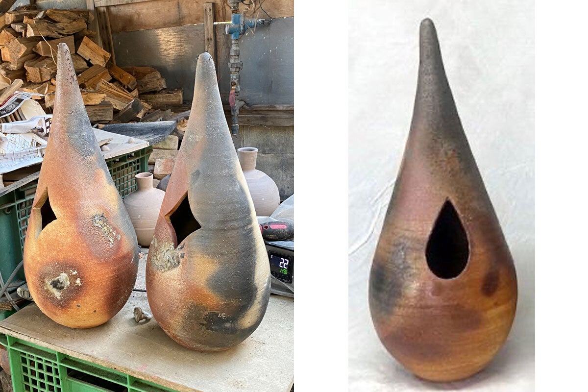 左が窯から出してまだ灰を掃除していない古代焼、右が入選した作品「雫」