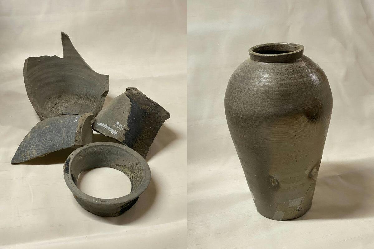 当時発掘された須恵器のかけら(左)と、私が研究中に焼いたテストピース(右)