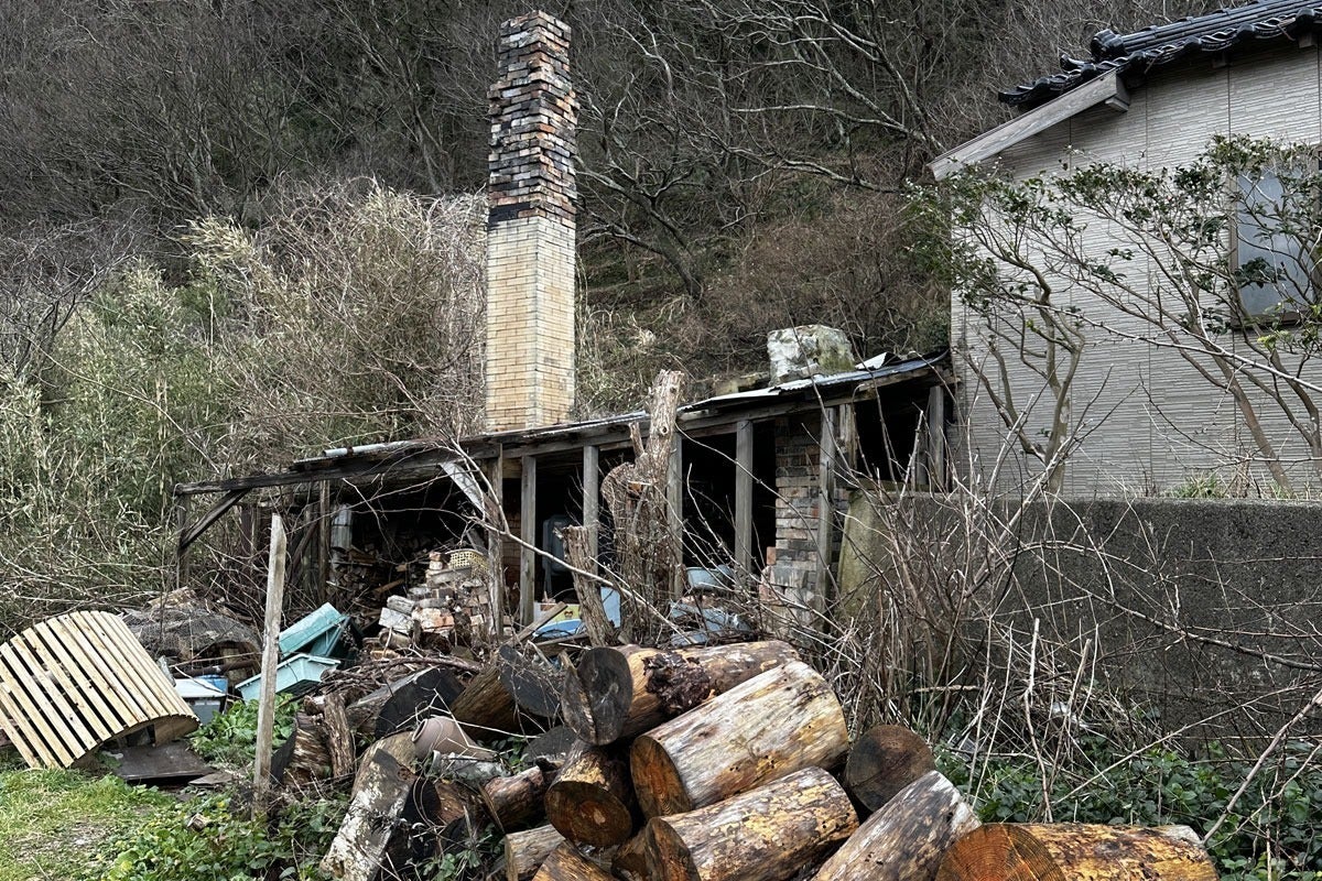 地震発生時には、大きさ2mほどの岩が山から落ちて来て旧窯の6m程の高さの煙突1基に直撃、もう1基も、揺れで倒壊、およそ6トンのレンガ1,600丁が散らばりました。隣の母屋にいましたが、その屋根にも散らばり一部破損、本当に危機一髪でした・・・。