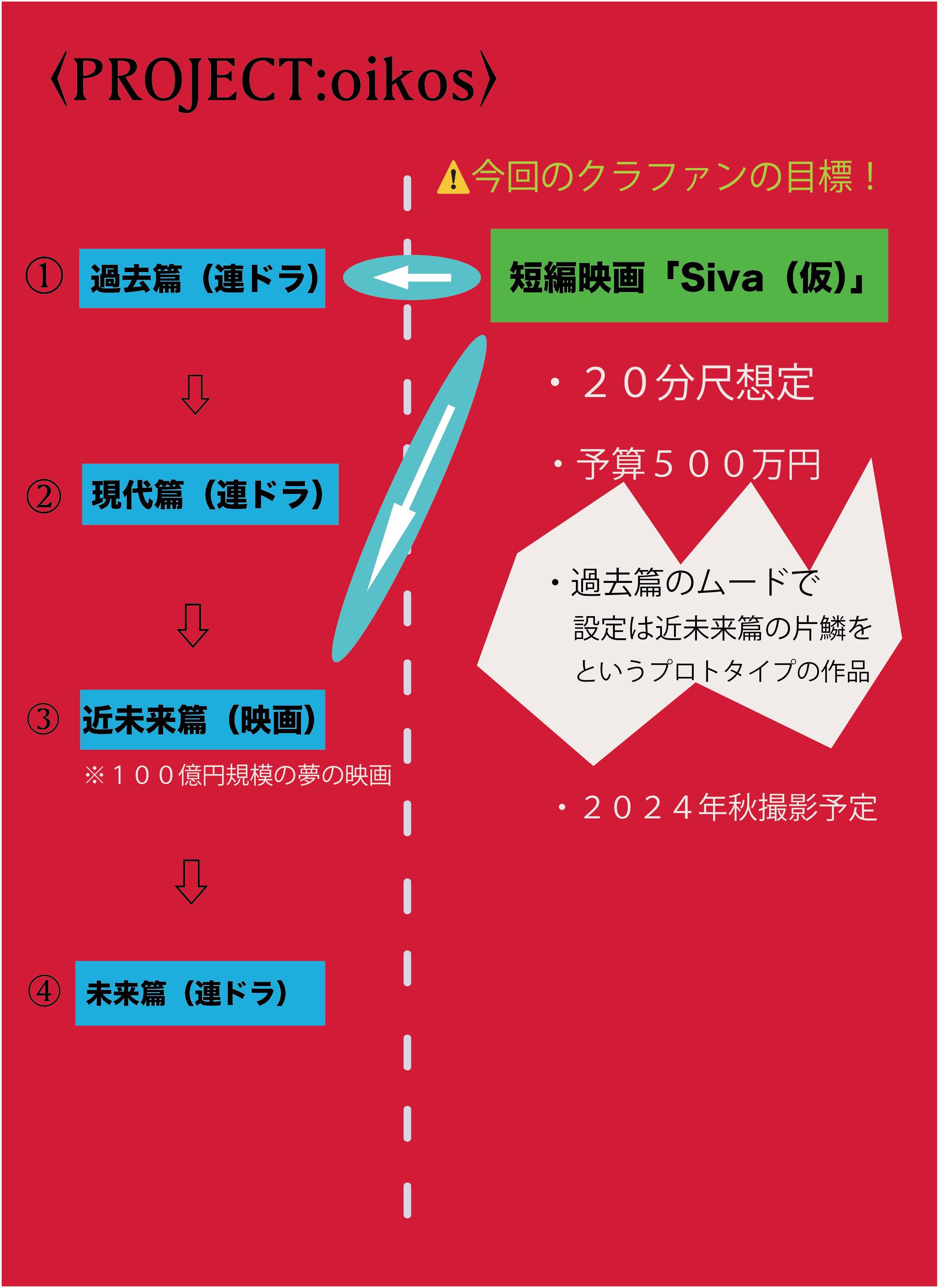 この表は、今回のクラファンで作る短編映画「Siva(仮)」を含めた、スペクタクルSFを撮るまでの早見表です。この先、文章を読み進めていくにあたり、迷ったらこの表に戻ってください。