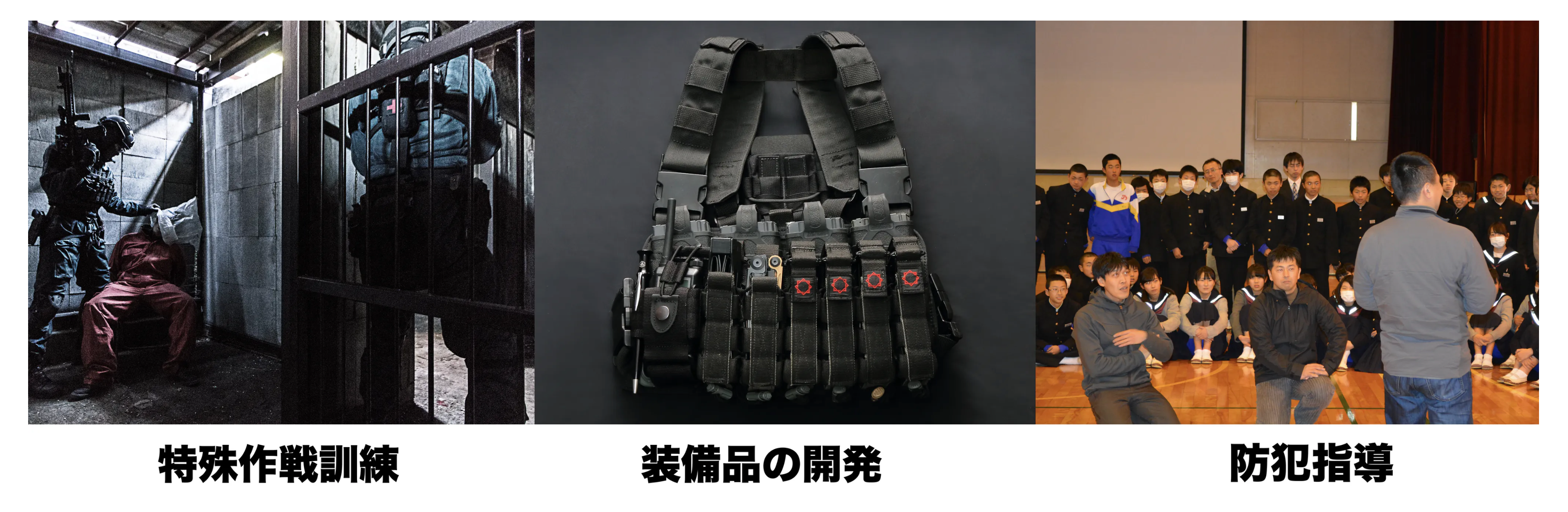社員には警察・自衛隊の元特殊部隊が複数在籍しており、その経験を活かした戦闘職種の装備品開発・技術講習が主たる業務であり、駐屯地への出張などを含め、今まで延べ1万人以上の警察・自衛官等その道のプロへ専門的なスキルを提供してまいりました。