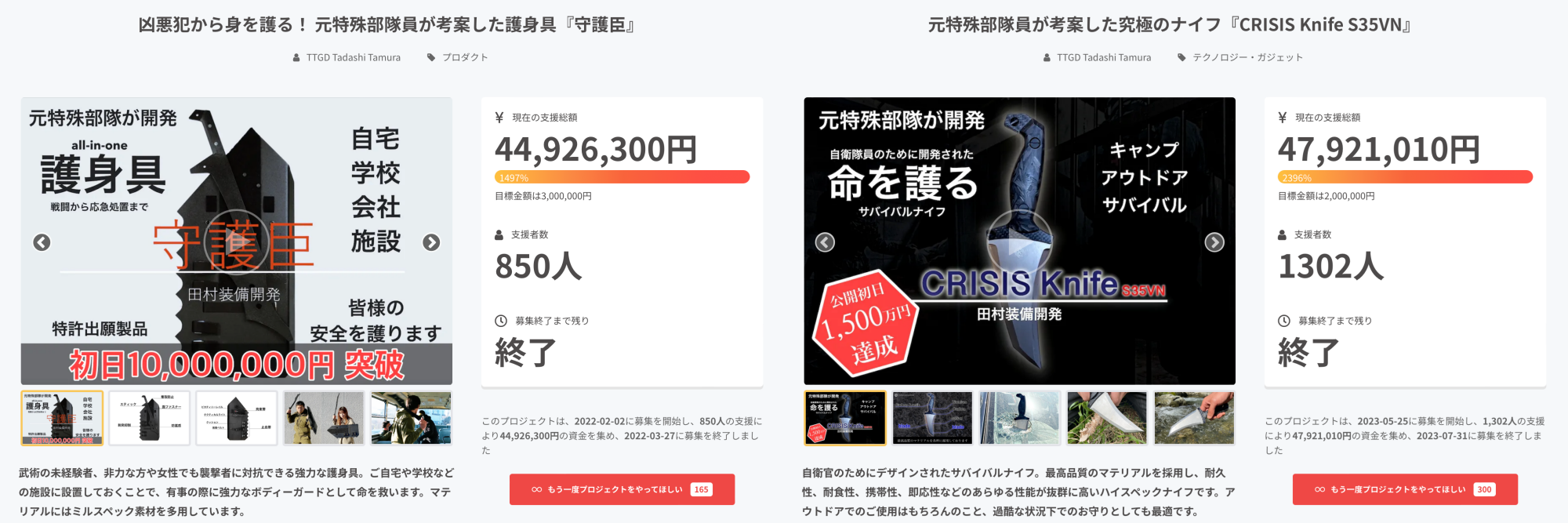 • 田村装備開発の田村です。昨年実施したCRISIS 01のプロジェクトにつきまして、「CAMPFIREクラウドファンディングアワード2024 発明で驚きを与えた部門 大賞」を受賞することができました!これも弊社の装備品を愛用し、応援してくださる皆様のおかげです。本当にありがとうございました。トロフィーも頂きました!本件につきまして、少し前にCAMPFIREの担当者様がご連絡くださったのですが、その際、「今まで行ってきたプロジェクトの再販を希望される方が大勢いらっしゃいます!」とお聞きしました。その人数を確認したところ、計3540件ものアンコールのお声を頂いておりました。皆様のご期待にお応えしたいと思い、すぐにCAMPFIREと打ち合わせを行いました。そして、今回アワード受賞記念といたしまして、護身具「守護臣」、ナイフ「CRISIS Knife」、タクティカルライト「CRISIS01」の再販、そして新製品「TTGDステルスハーネス」の販売を決定させて頂きました!新製品ですその他の『CRISIS Knife』や『CRISIS 01』、新製品の『TTGDステルスハーネス』につきましては、数量限定の超早割や早割特価にてリターンを設定致しました。本日より『間も無く公開のプロジェクト』にUPされましたので、ご検討いただける方は是非『お気に入り』にご登録ください。(公開されるとメールにてお知らせが届きます)こちらからプロジェクトページに入れますhttps://camp-fire.jp/projects/827785/view?list=watched引き続きよろしくお願い申し上げます。ありがとうございました。田村装備開発 代表取締役社長 田村 忠嗣 もっと見る