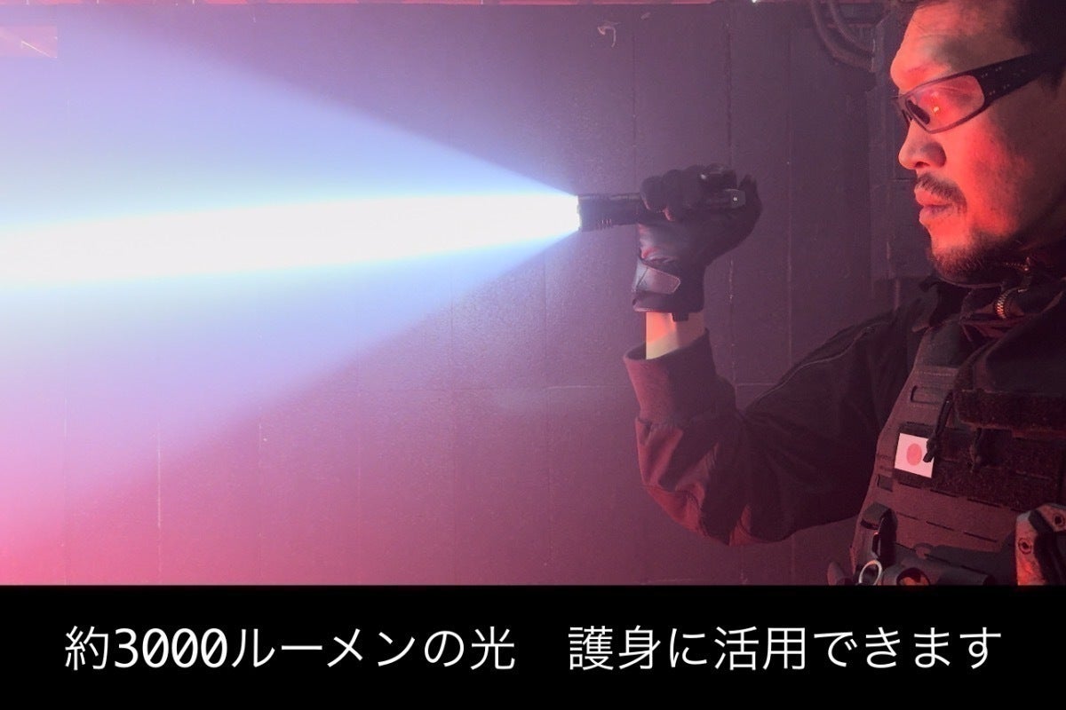 警察・自衛隊の元特殊部隊が開発したフラッシュライト。耐久性・即応性が抜群に高く、光量は約3000lm、光角もプロ用に調整したLEDライトです。過酷なミッションはもちろんのこと、日々の防犯・災害対策に活用できますので有事の際のお守りとして最適です。