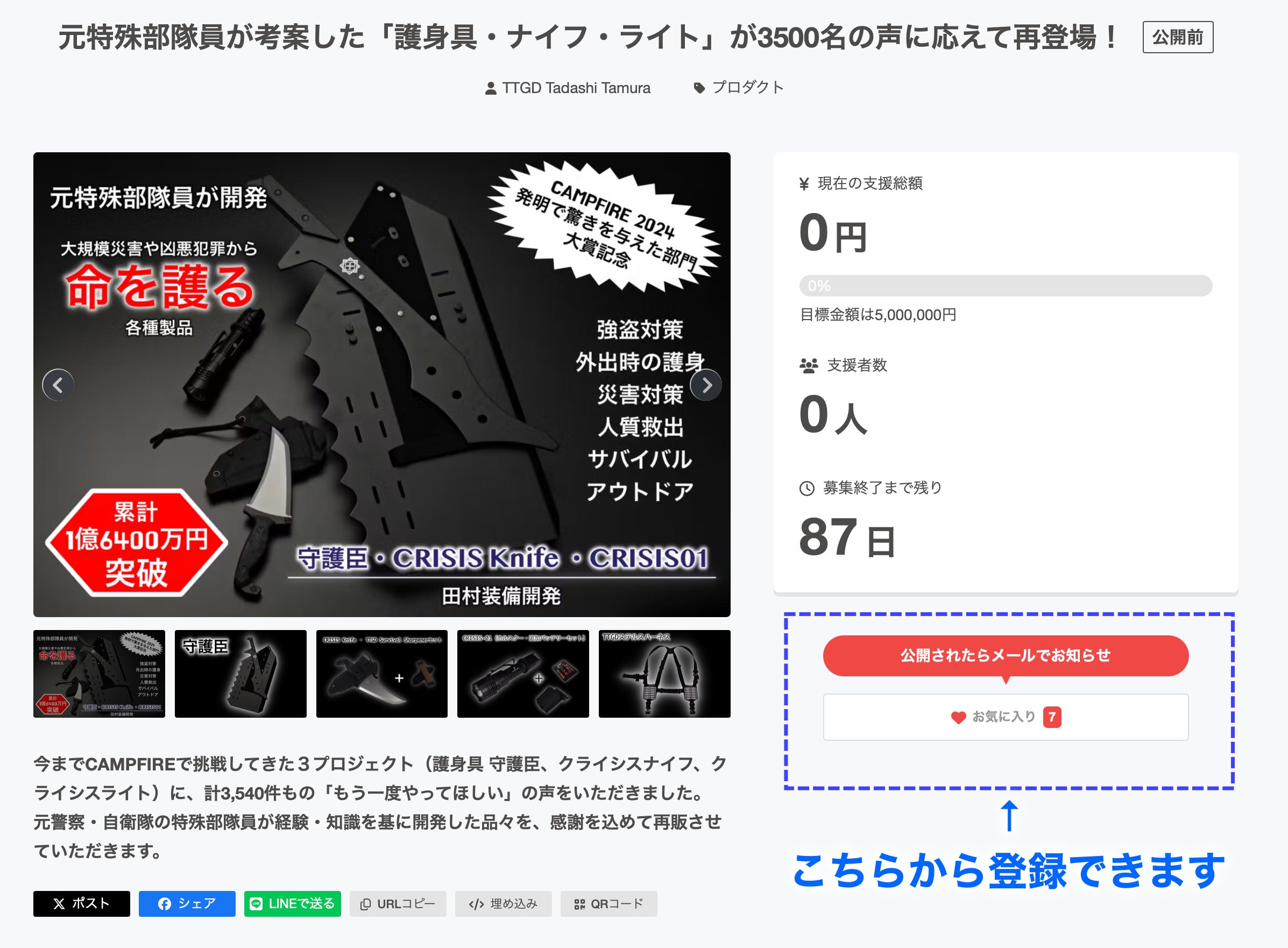 その他の『CRISIS Knife』や『CRISIS 01』、新製品の『TTGDステルスハーネス』につきましては、数量限定の超早割や早割特価にてリターンを設定致しました。