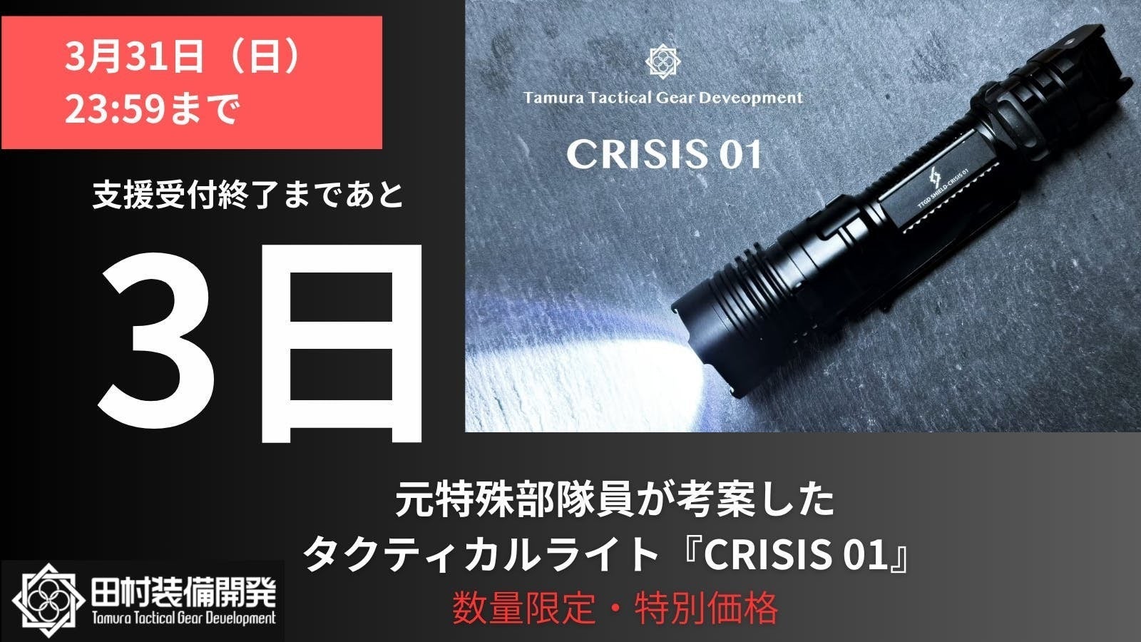 田村装備開発の田村です。「CRISIS-01を収納するポーチが欲しい」といったご要望にお応えし、CRISIS-01だけでなく、様々なライトに対応したポーチ『TTGD Flashlight Pouch』を開発いたしました。CAMPFIRE終了9日前ですが、ギリギリ間に合いましたので、本日18時より受付を開始させて頂きます!「単品」と「ペアセット(2個セット)」の2種類のリターンになります。両リターンとも「超早割」と「早割」がございます。シンプルですが、とても機能性に優れた製品が完成しました。ショルダーキャリーとの相性もバッチリです。詳細は下記の動画をご覧くださいませ。本日18時にリターンが追加されますのでご検討頂けましたら幸いです。引き続き、何卒よろしくお願い申し上げます。田村装備開発(株)代表取締役 田村 忠嗣