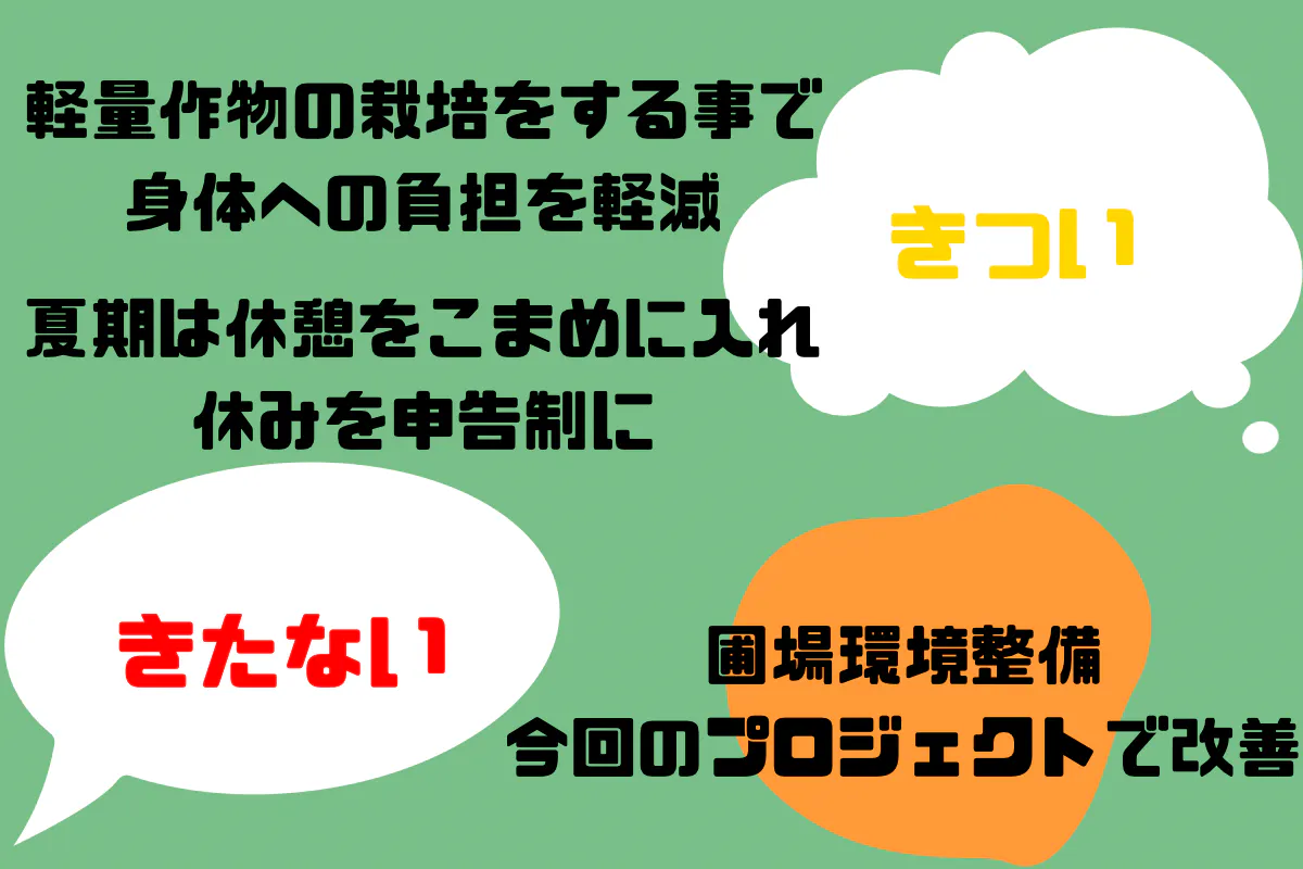 また"魅力的な農業"に近づける為にはどうしたら良いかと従業員や第三者に聞いた所、農業のきつい、きたないという2点のイメージを改善する必要があると考えました。